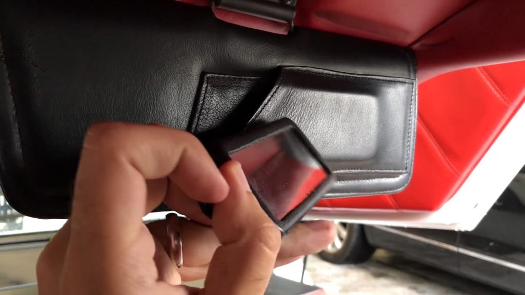 Nem elég, hogy a vezetőoldali napellenzőt lehajtva semmit sem fogsz látni, az utasoldali ellenzőbe sminktükör is került. Nem vacakoltak holmi beépített darabbal, kivehető a bőrkötéses tükör, aminek más hasznát is vehették a nyolcvanas évek Miamijában.