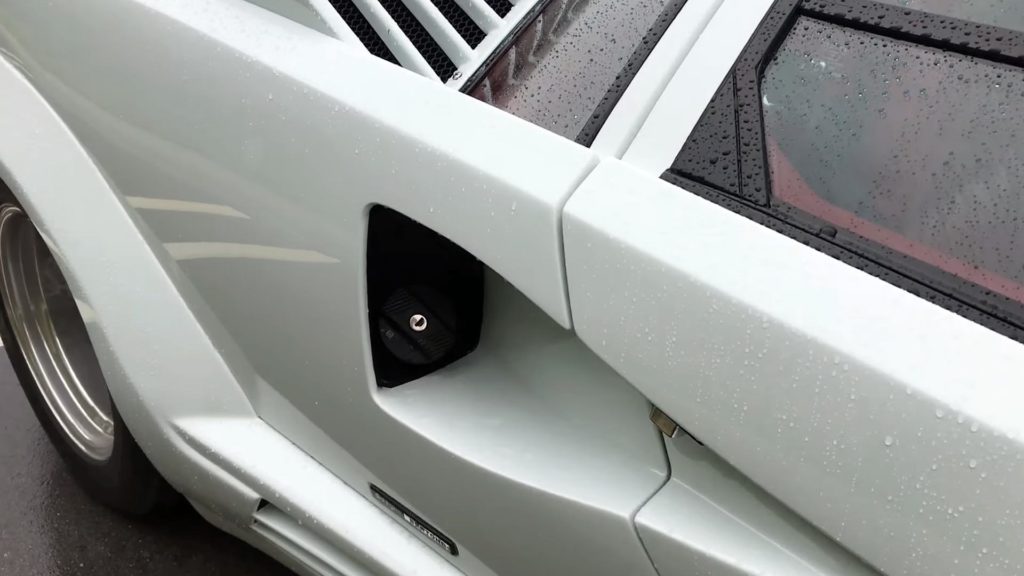 Nem egészen így van, de amíg a Countach bal oldalán a légbeömlő nyílást találod a motorhoz, addig a jobb oldalt ebbe a nyílásba került a tanksapka. Mindenesetre messziről nézve furcsa látvány lehet, amint a légbeömlőbe tankolod a benzint.