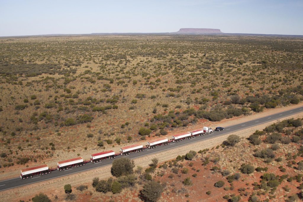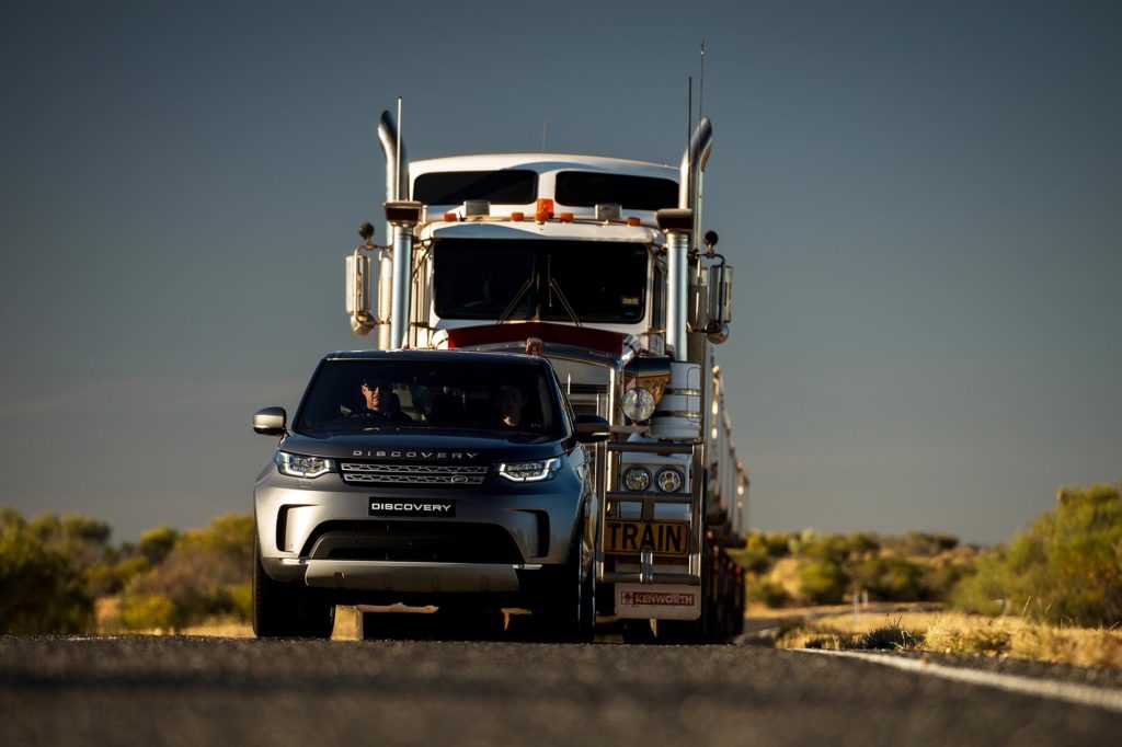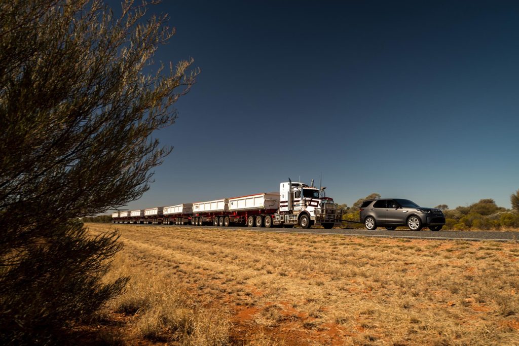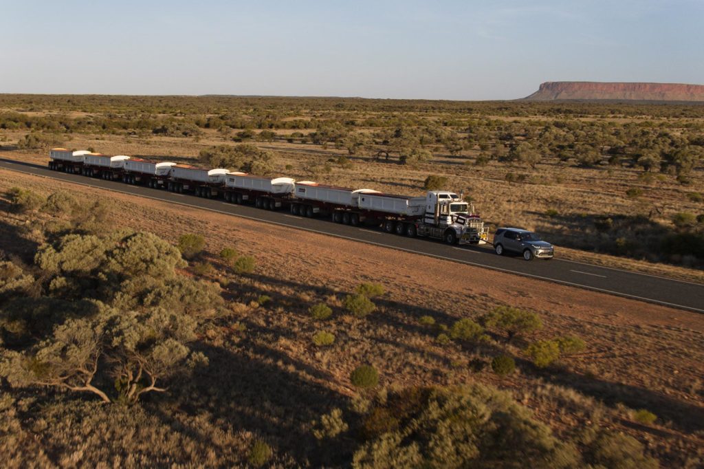 Ausztráliában nem ritkák az ilyen szerelvények, ahol sok áruval nagy távokat kell leküzdeni. Bár a szabályok szerint a maximális hosszúságuk 53 méter, most a Land Rover ehhez a rekordkísérlethez engedélyt kapott arra, hogy egyszerre hét pótkocsit kössön egy vontató mögé.
