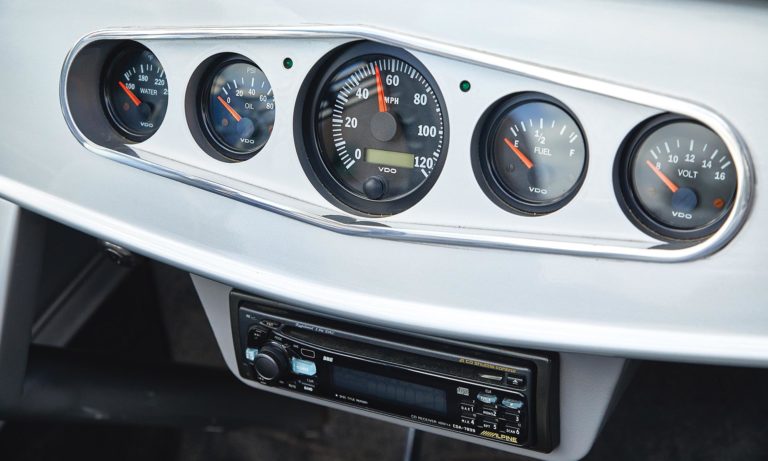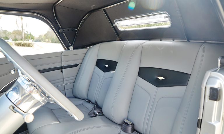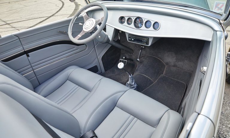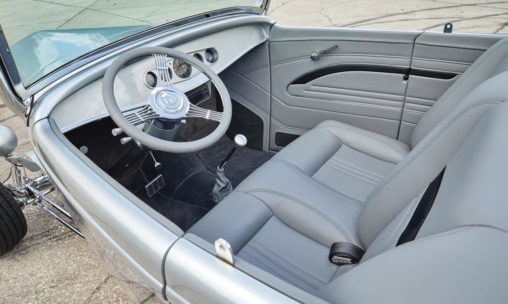 Bőrrel vonták be a belső teret, a kapcsolók fémből készültek, és még a váltókar is a kézi váltókét idézi, pedig a szerkezet egy négyfokozatú automata, ami a nyolcvanas évekből származik. Persze a motorja sem eredeti, de nem is Ford, hanem a General Motors 5,7 literes V8-asa.