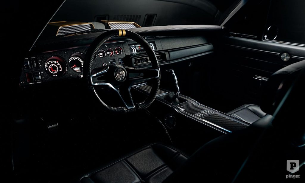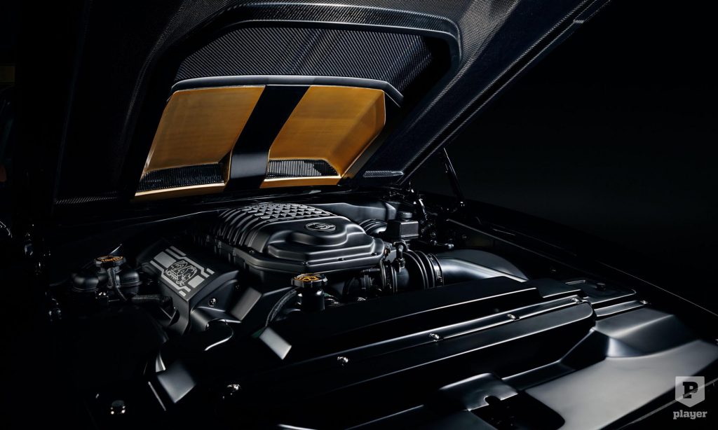 Fekete fényezését aranyszínű betétekkel dobták fel, az elöl 19, hátul 20 colos HRE kerekek is ebben az árnyalatban pompáznak. A dizájnnál még érdekesebb a műszaki tartalom, az eredeti V8-asa helyére ugyanis a Mopar által gyártott Hellephant erőmű került.