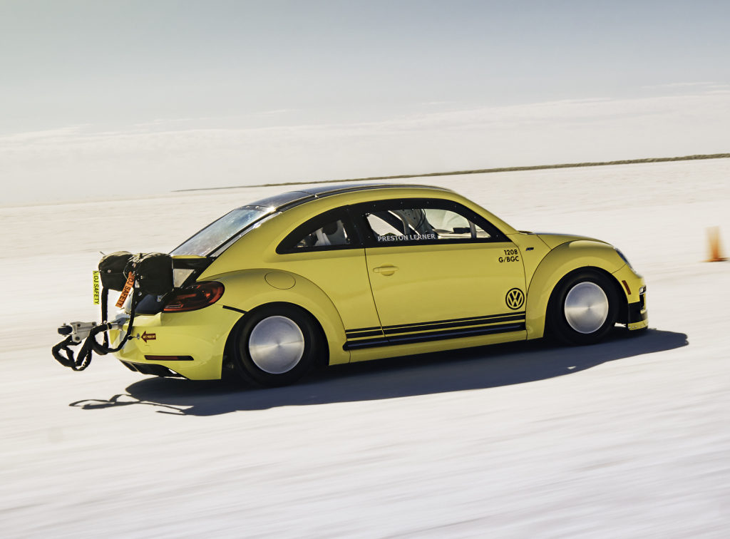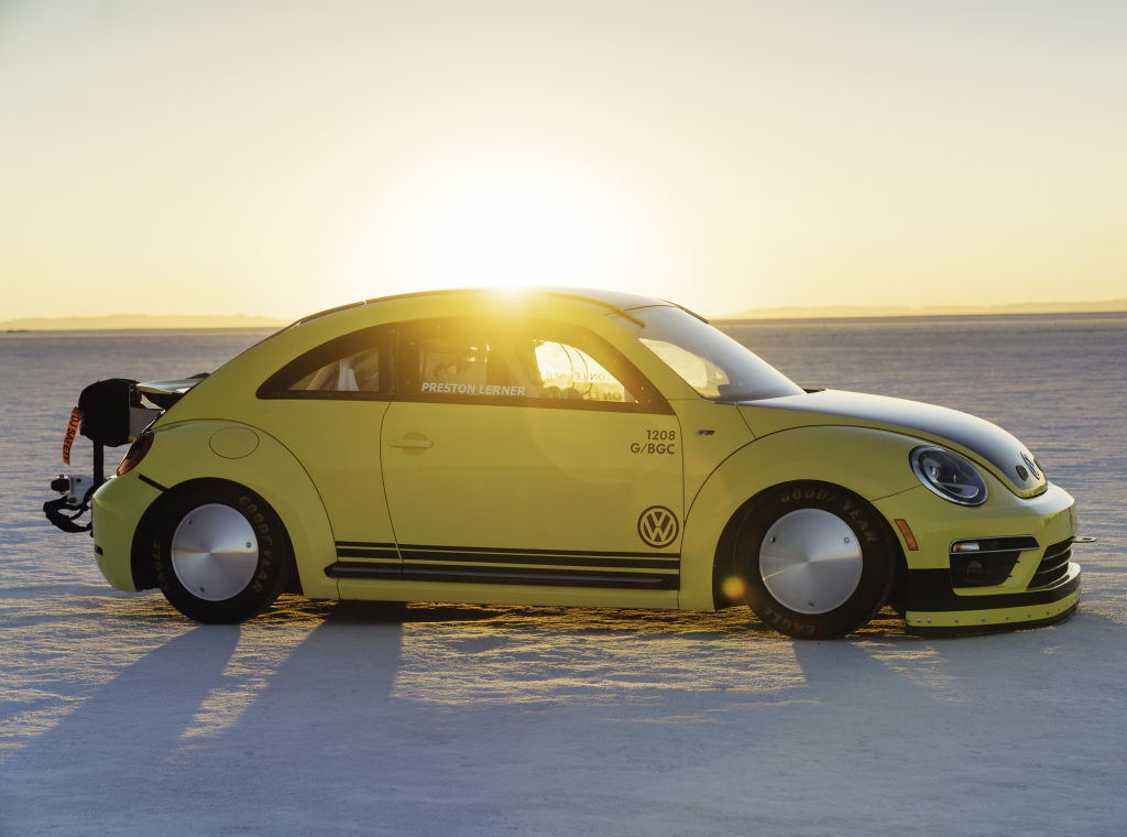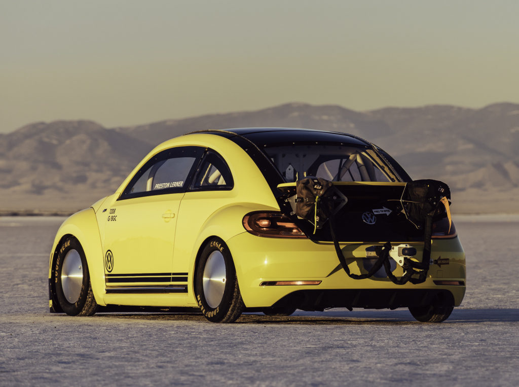 A bonneville-i sóstómeder a szivar alakú sebességrekorder prototípusok otthona évek óta, ezért néz ki furcsán az a sárga színű Volkswagen Beetle, ami nemrég feltűnt a pályán. Persze miután megtudod, hogy a 2.0 TSI nem éppen széria, hanem 550 lóerős, máris megnézed közelebbről.