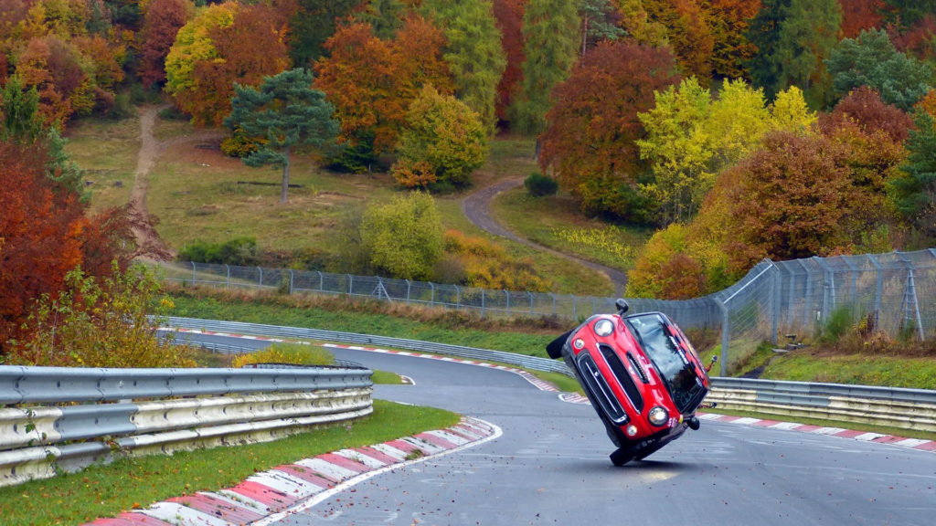 A bukókerettel és kagylóüléssel szerelt MINI Cooper S-re speciális tömör abroncsok kerültek, hogy szó szerint bírják a gyűrődést. A videón ugyan fájdalmasan lassúnak tűnik a kör, de ne feledjük, a 20,8 kilométeres pálya igen változatos, így nem kis kihívást jelentett végig megtartani az autót.