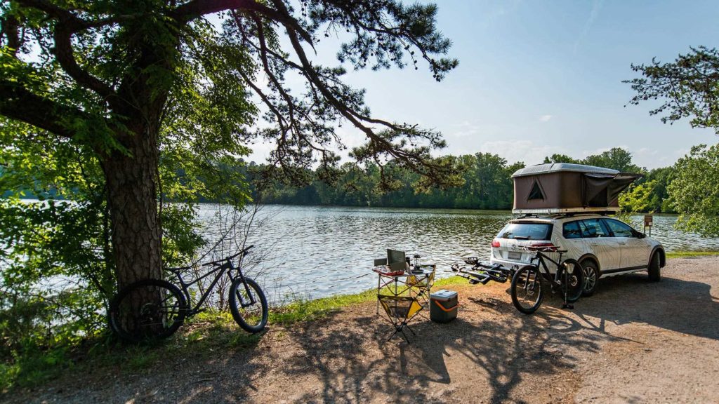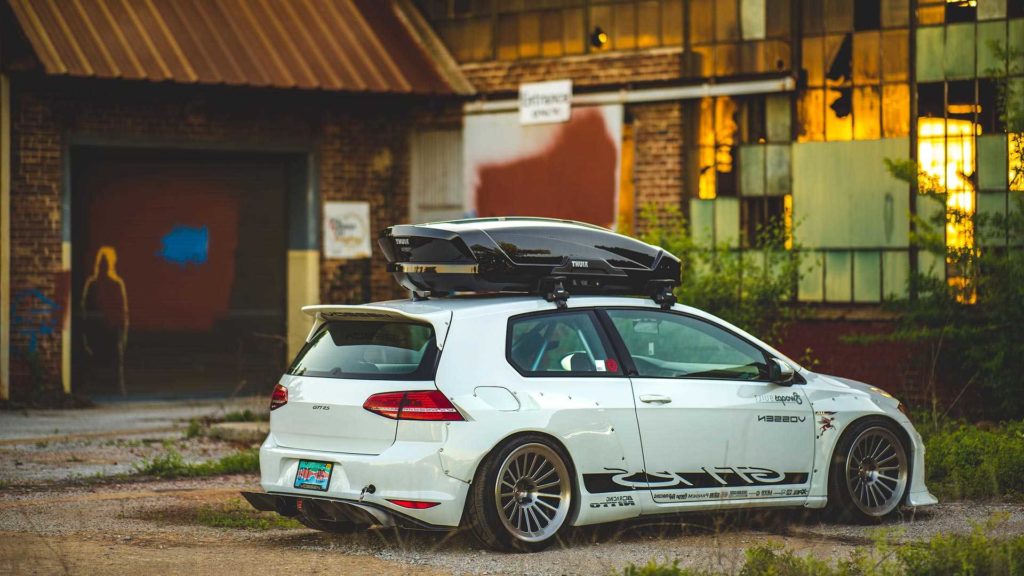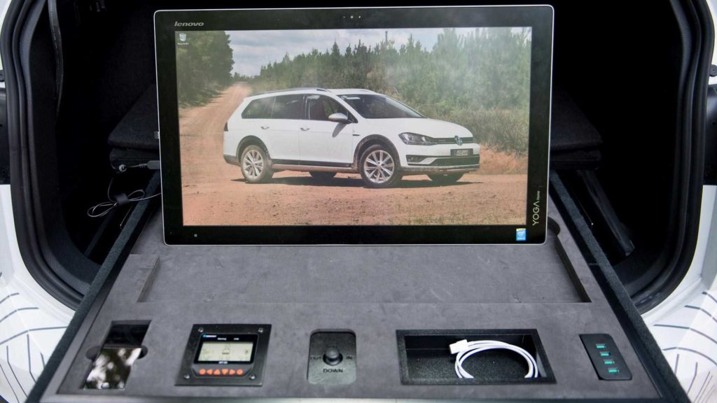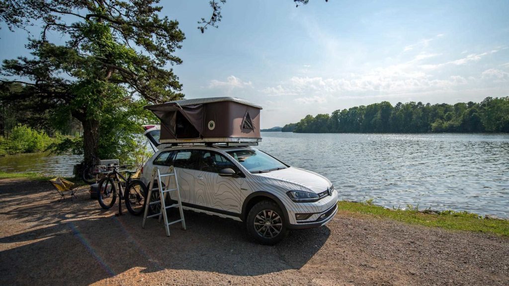 Az ültetett autók után jöjjön egy megemelt példány. A Golf Alltrack már szériaváltozatban is magasabban fut, és ezt a koncepciót még szívesebben viszed kirándulni, hiszen a tetejére sátor került, amin napelemek is helyet kaptak, a hátuljára két kerékpárt rögzítettek, a csomagtérben pedig egy komplett mini házimozi van, amit a tábortűz fényénél nézhetsz a szabadban.