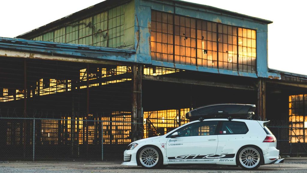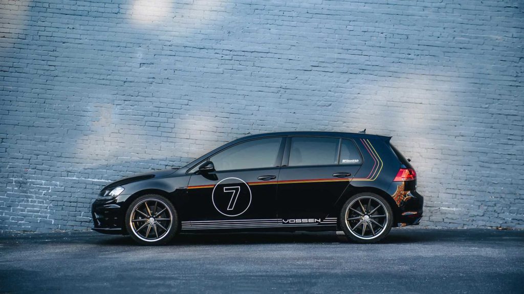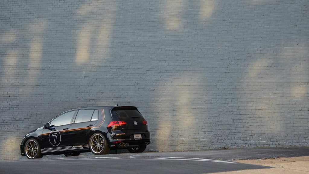 Más stílus kedvelőinek készült a Golf R Heritage Concept, ami inkább a régi idők autóit eleveníti fel. A fekete karosszéria oldalán végigfutó piros, narancs és sárga csíkok a német zászló színeit idézik, és a rajtszám betűtípusa is nagyon retró. A komoly ültetés és a matt fegyverszürke Vossen alufelnik teszik teljessé a képet ezen a Golfon.