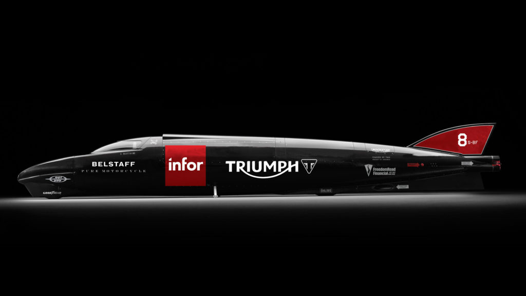 Megdöntené a szárazföldi sebességrekordot a kétkerekű járművek között a Triumph Motorcycles. Az Infor Rocket Streamliner persze inkább hasonlít egy szárnyak nélküli vadászgépre vagy egy rakétára, mint egy motorkerékpárra, de az igaz, hogy két kereke van. 7,6 méter hosszú karosszériája karbon-kevlár anyagból készült, az elöl lévő zárt kabinjában Guy Martin lesz a pilóta.