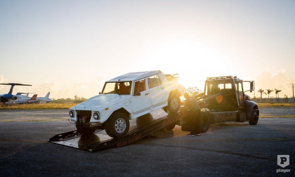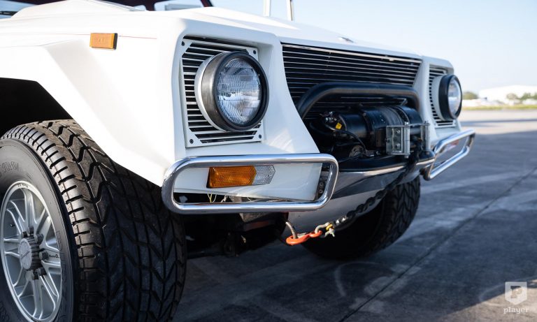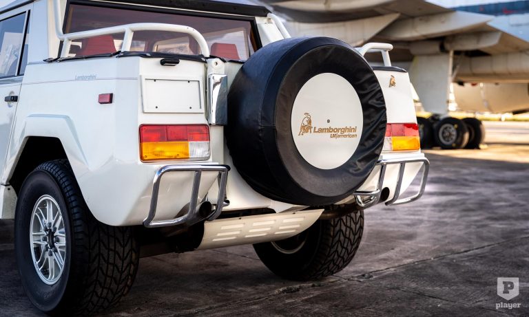 a Lamborghini terepjárója, az LM002, ami annyira új, hogy még az eredeti Pirelli abroncsok vannak rajta.