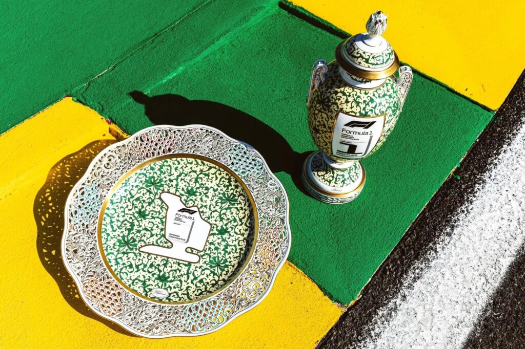 A Magyar Nagydíj dobogósainak és a győztes konstruktőrének járó (neoklasszicista stílusú) díjakat természetesen idén is a Herendi Porcelánmanufaktúra készítette, mintája pedig egy különleges, távol-keleti motívum, ami a „Császári bazsarózsa” nevet viseli – ez egy stilizált zöld rózsa növényi indákkal és levelekkel, a trófea alapszíne a bézs, tükrében pedig a Hungaroring sziluettje jelenik meg: