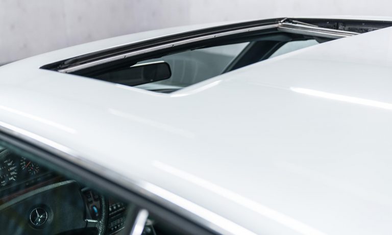 A fehér színű, szürke velúrkárpitos kupé felszereltségével is meg lehetsz elégedve, hiszen szervokormány, központi zár, elektromosan állítható ülés, klímaberendezés és napfénytető is van benne. A gyönyörű 420 SEC ebben a