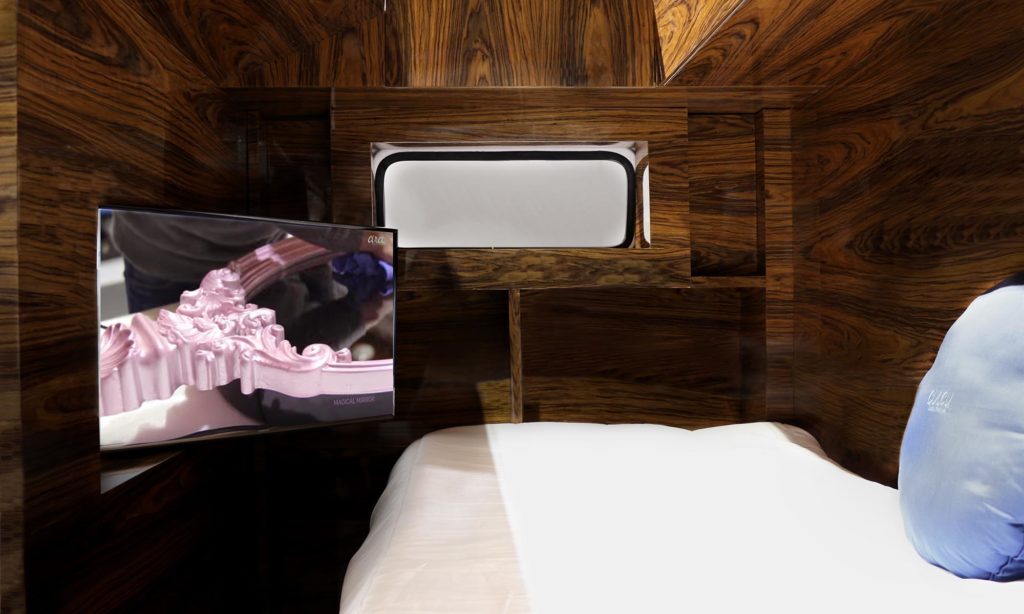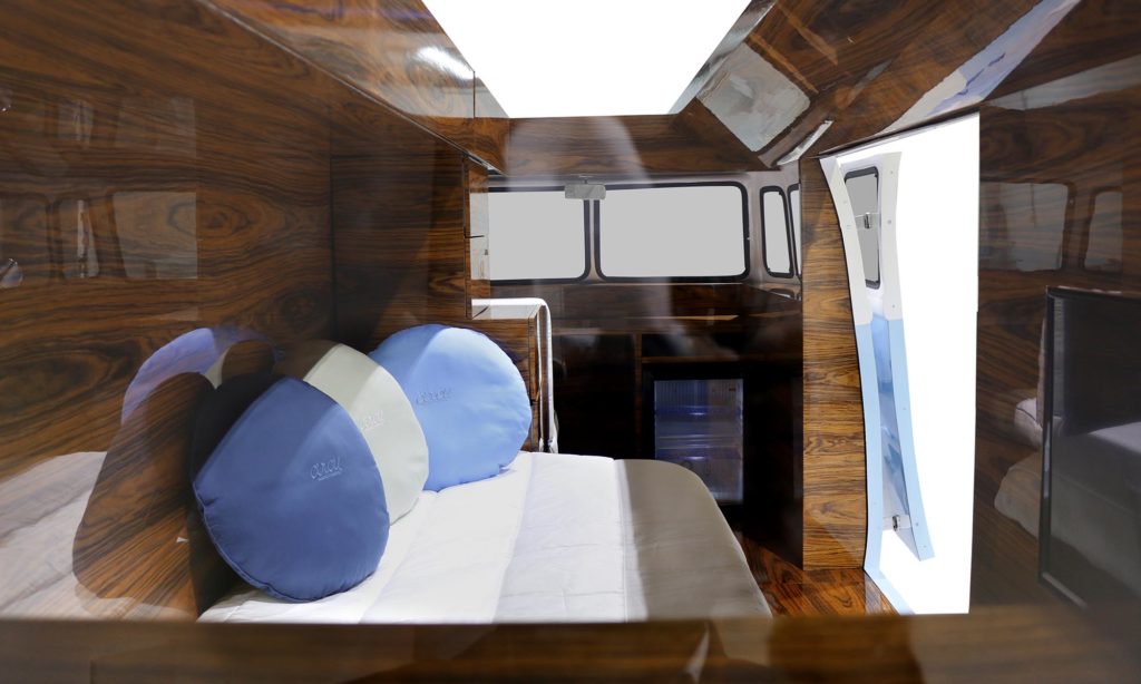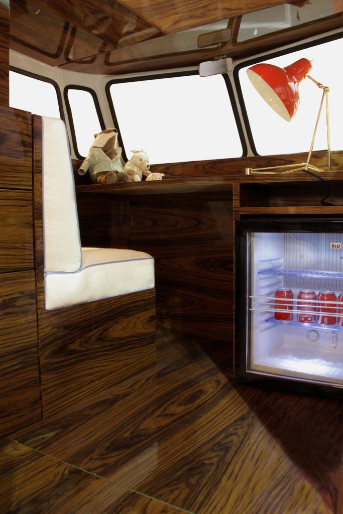 A tágas belső térben helyet kapott egy ágy és egy tévé, a vezetőfülkét pedig tanulószobává alakították, és még egy kis hűtőszekrénynek is maradt hely a fedélzeten. A meglehetősen élethű karosszéria üvegszálas anyagból készült, tele van ablakokkal, a belső tér burkolatát pedig paliszander fával tették otthonosabbá.