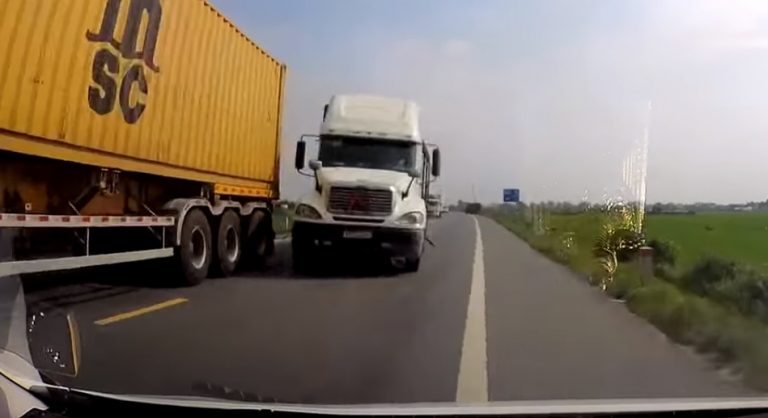 Az alábbi videón látható kamionos viszont nem feledékeny, hanem arrogánsan és életveszélyesen pofátlan: bőven lenne ideje visszatérni a szerelvény mögé, amit éppen előz, de hiába látja, hogy jönnek szembe, ő bizony előz, vagy inkább halad mellette.