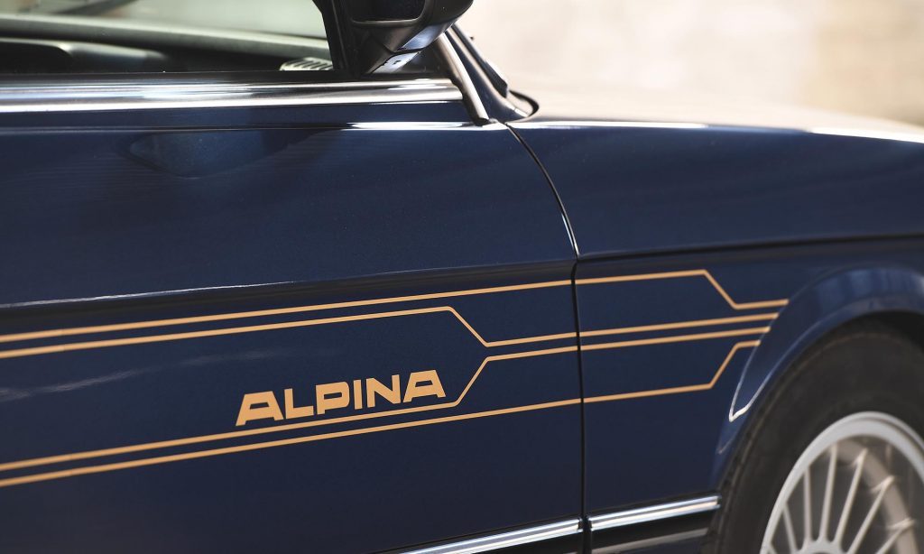 A sötétkék fényezése az aranyszínű csíkokkal és a sokküllős kerekekkel az Alpina jellegzetes megjelenését adja neki, akárcsak belül a plüsskárpitos sportülések, a bőrrel bevont sportkormány vagy a fából készült váltógomb.