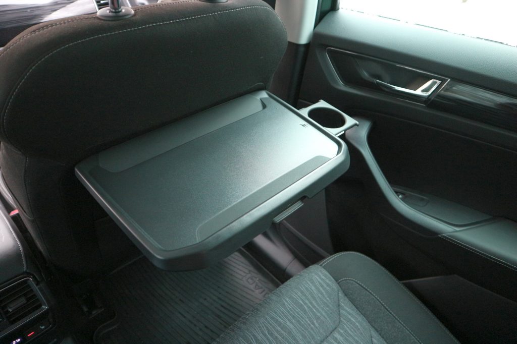 A szokásos skodás okosságokat is bírtam, ténylegesen használtam az ajtózsebben lévő kukát, a tanksapkafedél alatti jégkaparót. A gyerekek örültek a felhajtható hátsó asztalkáknak, amin még kihúzható pohártartó is volt. Ez az asztalka-dolog is megerősítette, hogy a Kodiaq igazából lélekben egy busz: ilyen extra nem SUV-okban, hanem egyterűkben szokott lenni.