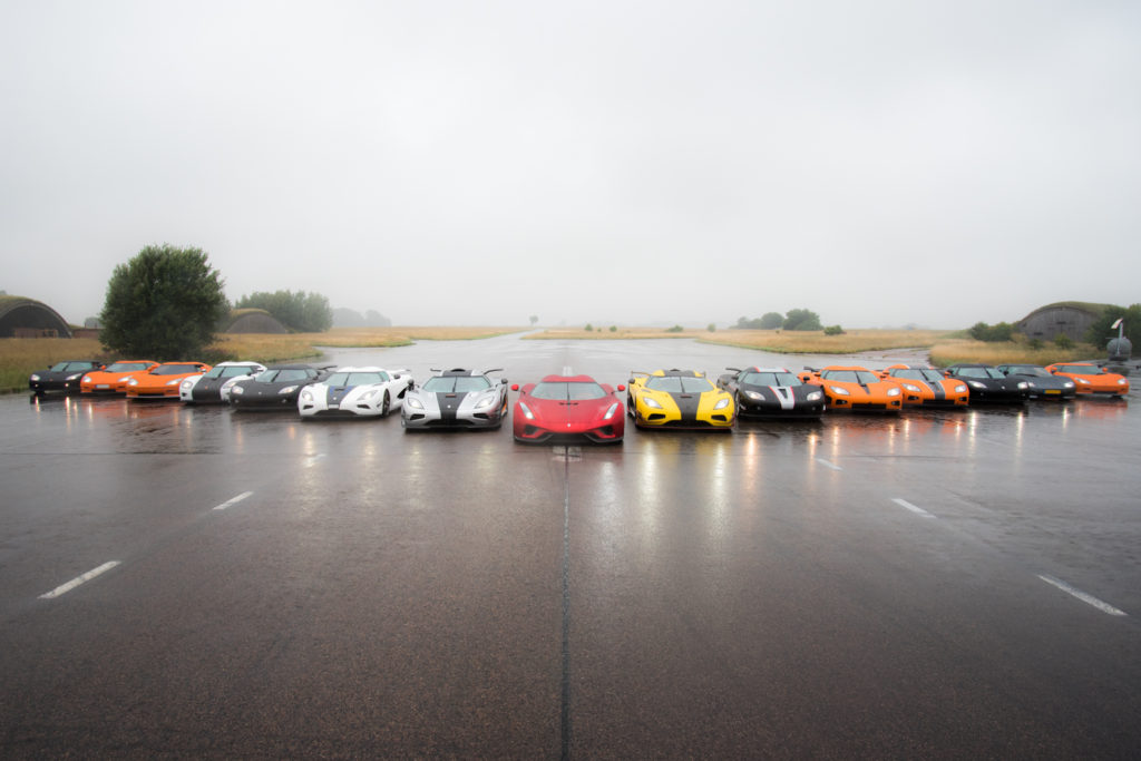 Már tizennégy éve, 2002 óta gyárt sportkocsikat a Koenigsegg, de csak most jutott eszükbe márkatalálkozót tartani. Christian von Koenigsegg, aki 1994-ben azért alapította cégét, hogy felülmúlja a McLaren F1-et, elmorzsolhatott egy könnycseppet: a valaha gyártott összes autó tizede ott volt az eseményen. (Ne számold meg a képen: ez 16 autót jelent.)