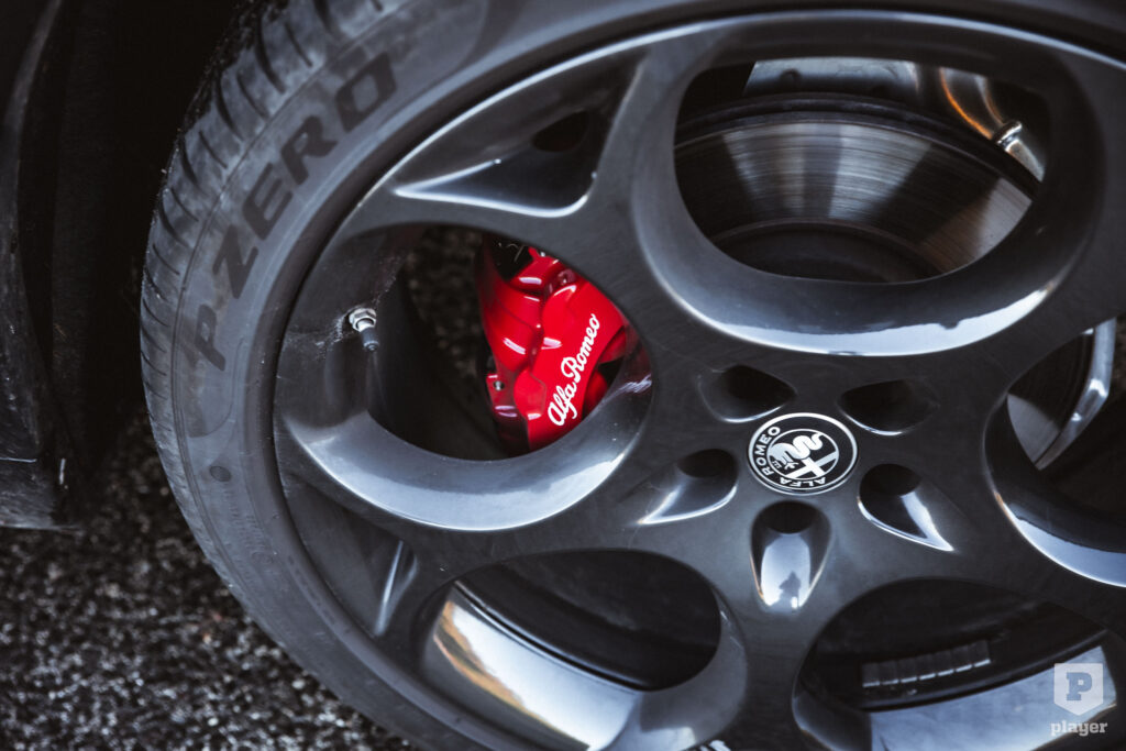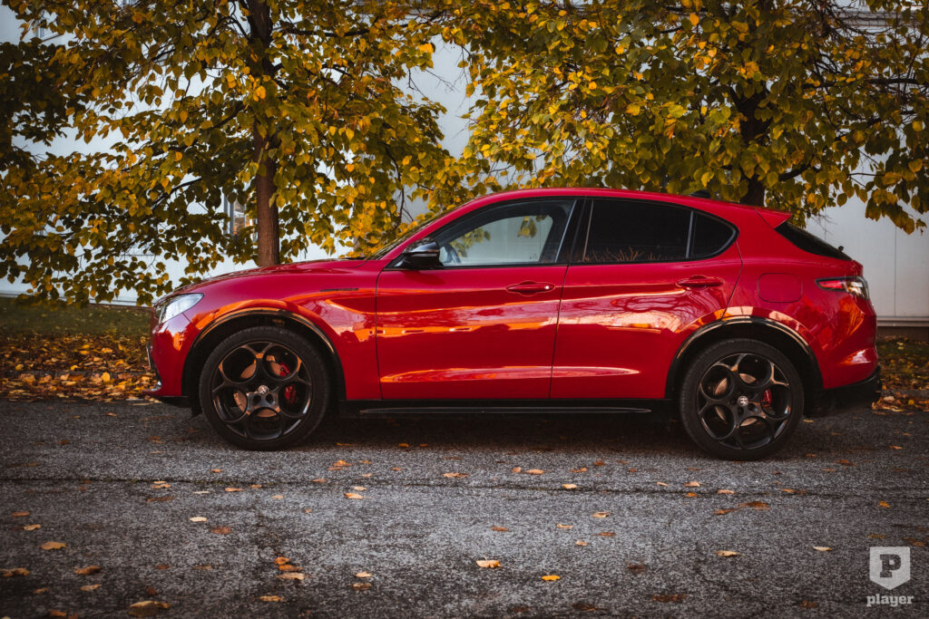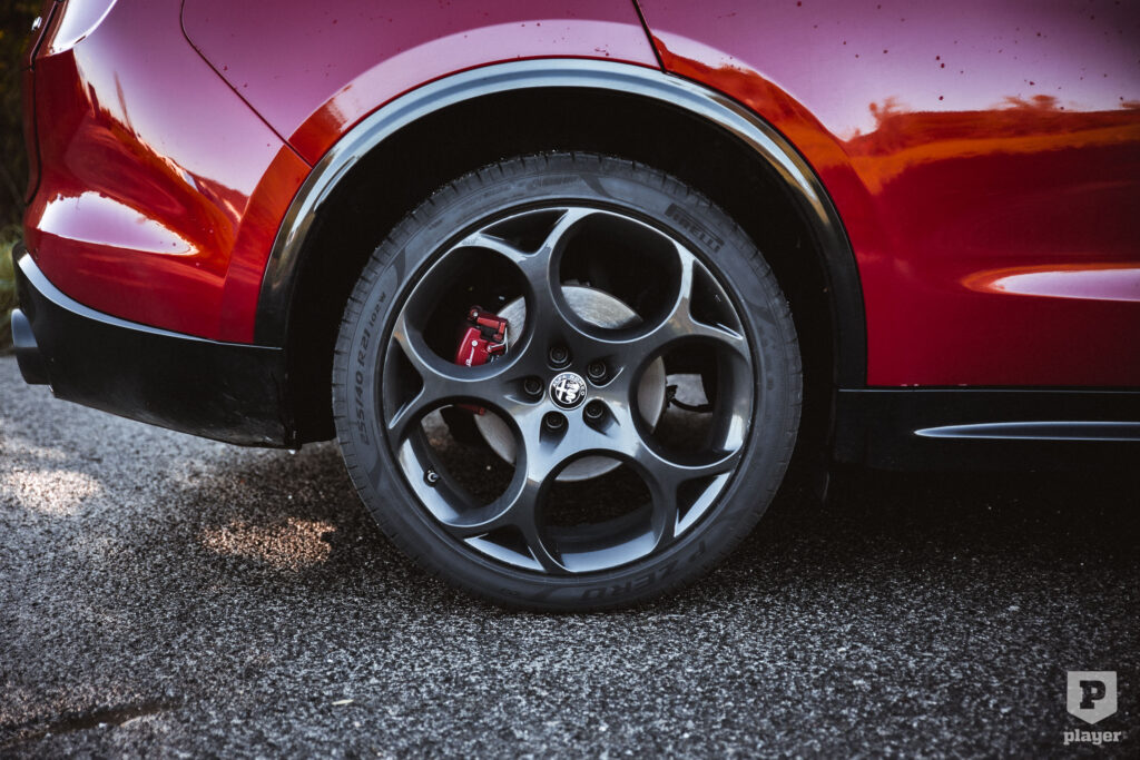 Csak ehhez érhető el a baromi jól kinéző Moonlight Matt nevű szürke karosszériaszín, ám ahogy a világ összes Alfájának, a Stelviónak is jól áll a piros – ami a kék és a fekete mellett szintén elérhető a Competizionéhez –, már csak azért is, mert a piros örök páros a feketével, amiből a Competizionén különösen sok van: fekete az Alfa-pajzs, fényes fekete az ablakkeret, matt feketék a kipufogóvégek, sötétítettek a hátsó ablakok és a lámpák. Alapárasak a 21 colos Dark Classico felnik és mögöttük a piros féknyergek, de ha pluszpénzt kellene fizetni értük, akkor is kötelezően ajánlott tételek volnának, annyit adnak hozzá az egyébként is ütős dizájnhoz.