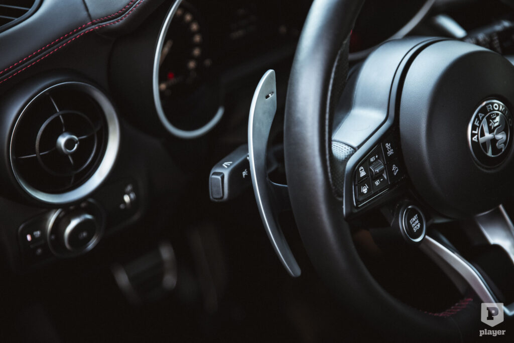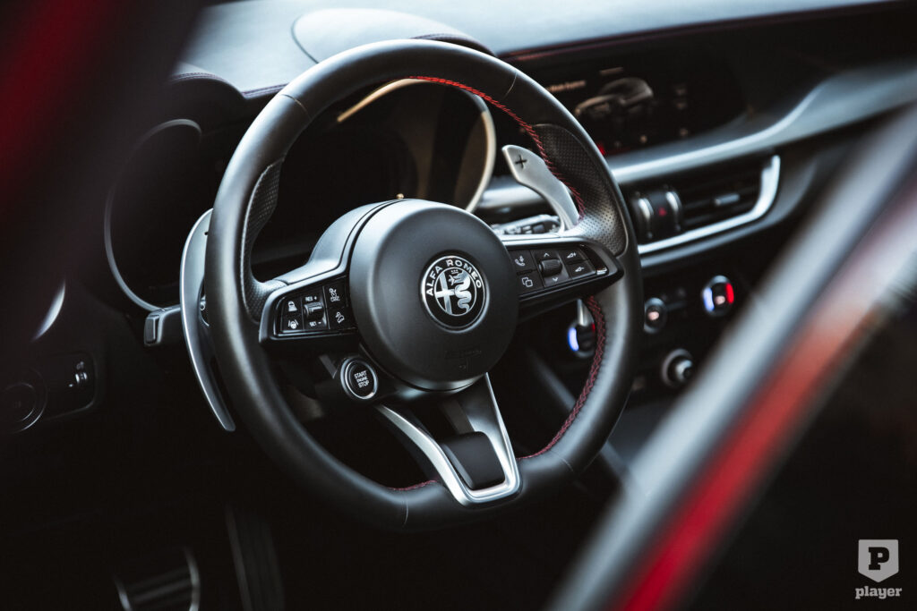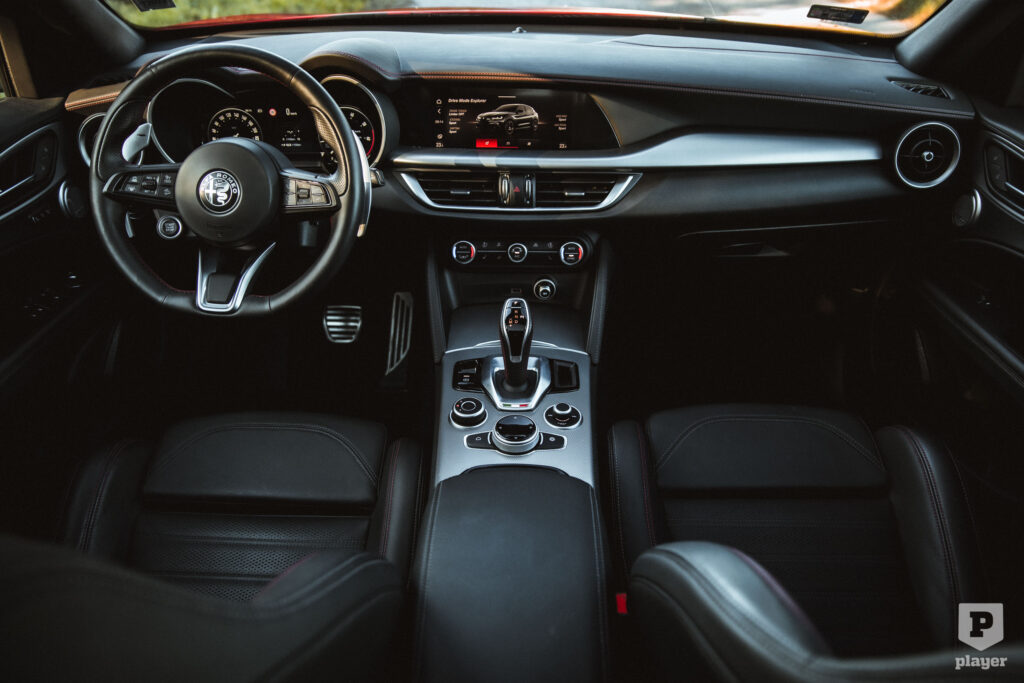 Gyakori, hogy az infotainment monitorja uralja a műszerfalat, a Stelvióban viszont kisebb, csak 8,8 colos, és szinte elrejtették, nem teszi tönkre a jó értelemben klasszikus hangulatot, nemcsak érintéssel, hanem tárcsával is vezérelhető. A klímaberendezésnek külön kezelőpanelje van valódi tekerőkkel és gombokkal – szomorú, milyen dolgoknak tudunk manapság örülni –, a kifejezetten jó fogású kormányon is ilyeneket találunk. Ott van az indítógomb is, ami menő, mivel azonban nem mindig a kormány középállásánál állítjuk le a motort, nem tudjuk odapillantás nélkül elindítani, keresni kell, hogy éppen hová esik.