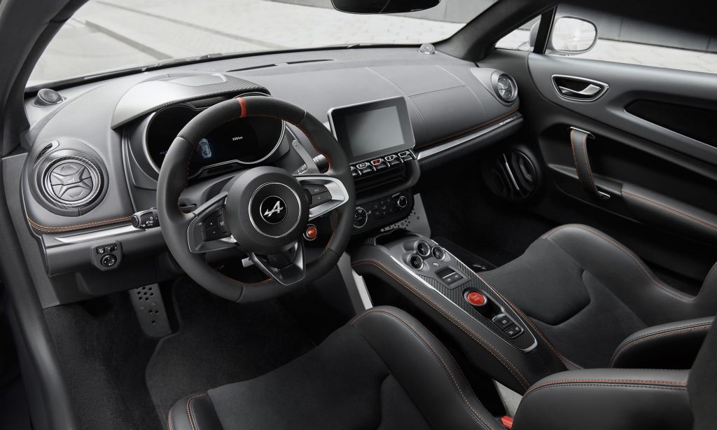ahogyan a fekete Alpine felirat és a narancssárga féknyergek is. Az utastérben kék helyett narancssárga cérnával varrták a kárpitot, a Sabelt sportülések és a szénszálas anyagból készült tető pedig tömegnek és a látványnak is jót tesznek.