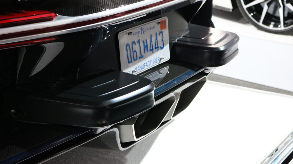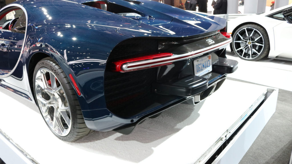 A 8 literes, 1500 lóerős W16-os motorral szerelt szuperautó fantasztikus formája természetesen teljesen mellőzi a hagyományos értelemben vett lökhárítókat, ám az Egyesült Államokban elvárják a biztosítók, hogy a kis sebességgel történő koccanás ellen védve legyen az autó. Így kerültek fel ezek a bumfordi ütközők a Chiron hátuljára.