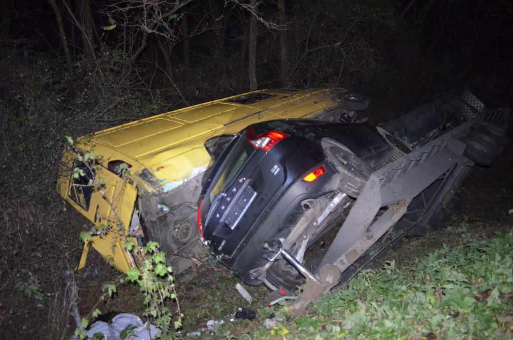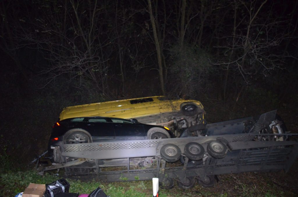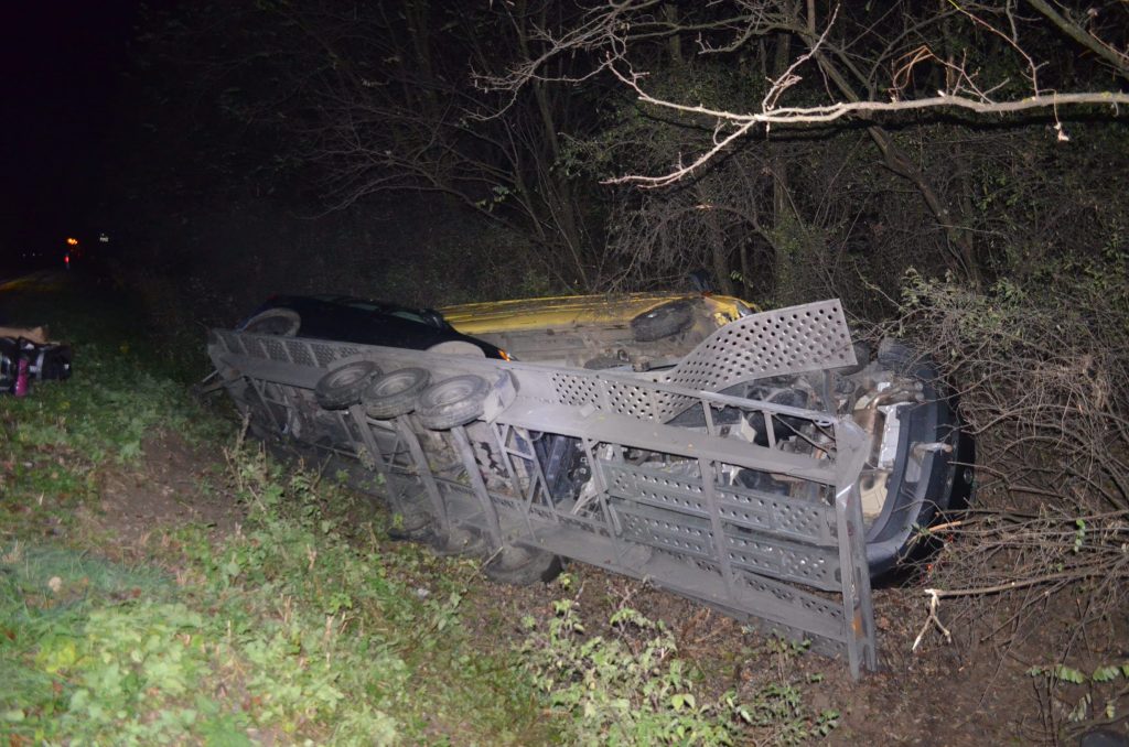 Nem tudjuk, vasárnap éjjel a 49-es úton haladó túlsúlyos román karaván is ezért balesetezett-e, az viszont tény, hogy a kisbusz és a két kocsit szállító utánfutó áttért a szemközti sávba, ahol érintőlegesen összeütközött egy vele szemben közlekedő autóval, majd a szerelvény az úttest melletti árokba borult. A vezető megsérült, a rendőrség vizsgálja az esetet.
