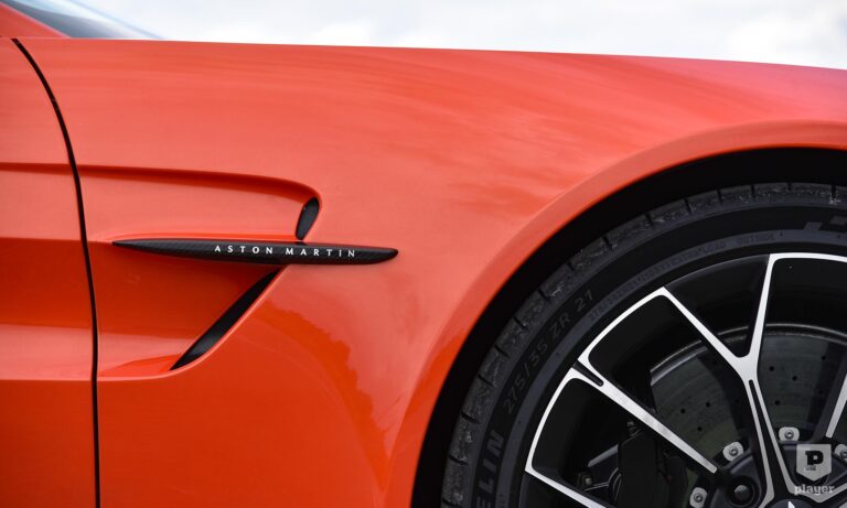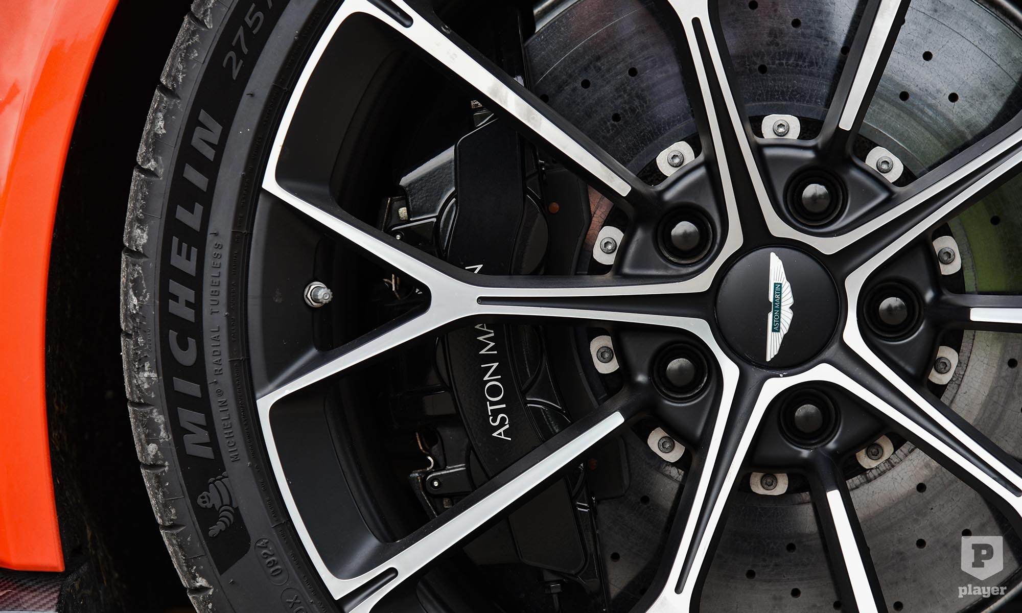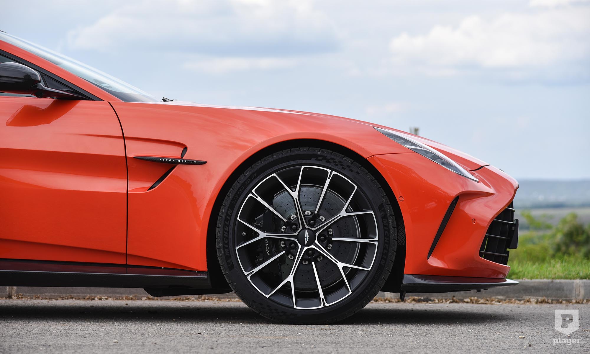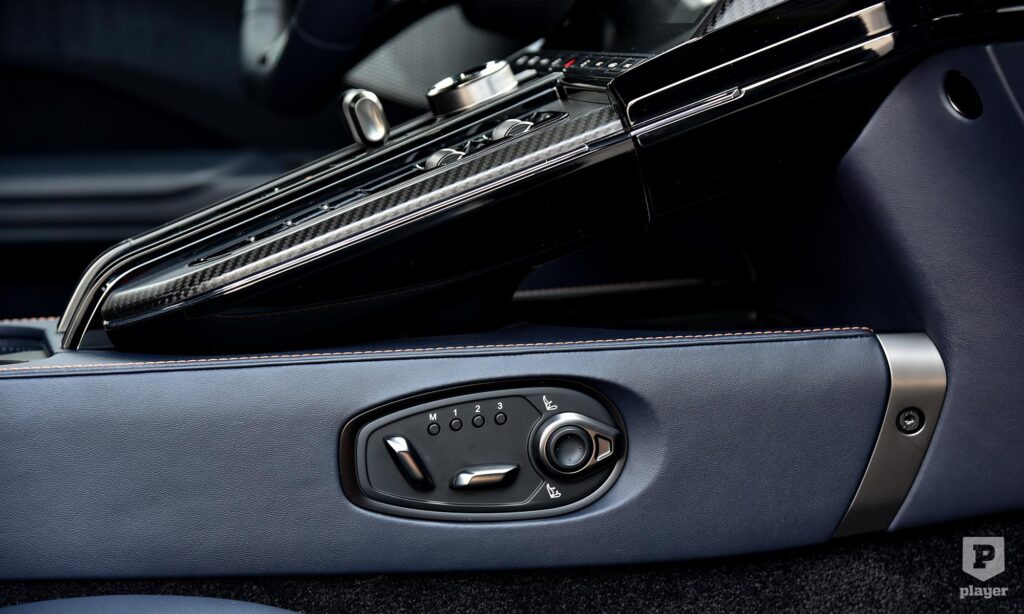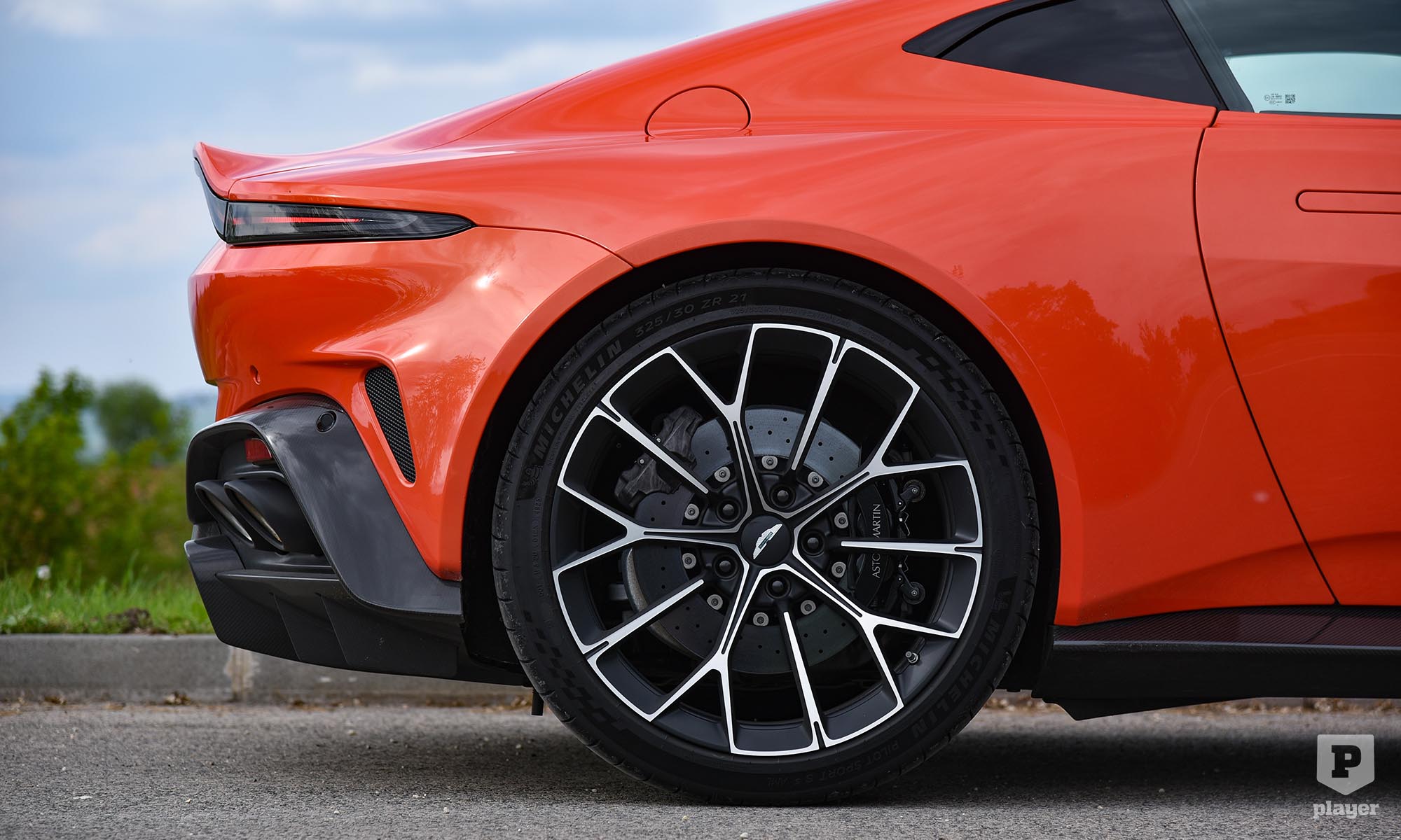 Kedvenc részletem az elképesztően elegáns, keret nélküli külső visszapillantó tükör, amit egy rendkívül karcsú szénszálas karra függesztettek, mintha csak egy légterelő idom lenne, és valójában az is, a forma és a funkció itt egymásra találtak. Gyönyörűek a 21 colos kéttónusú kerekek, hátul 325 milliméteres abroncsokkal, és ha már a részleteknél időzünk, a Vantage stílusához remekül illik az első sárvédők légkilépője, rajta az Aston Martin felirattal.