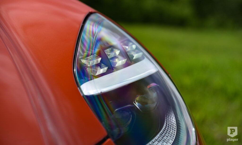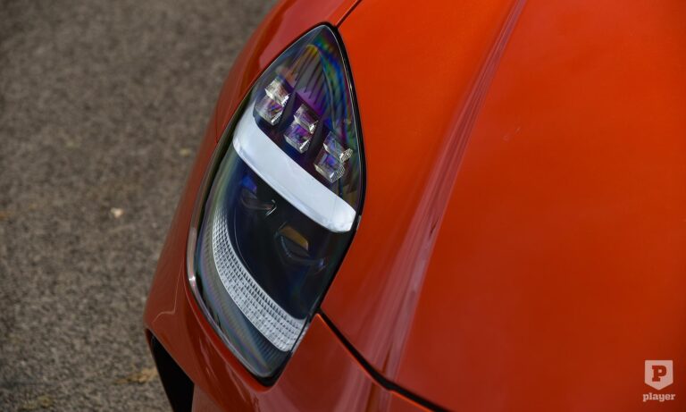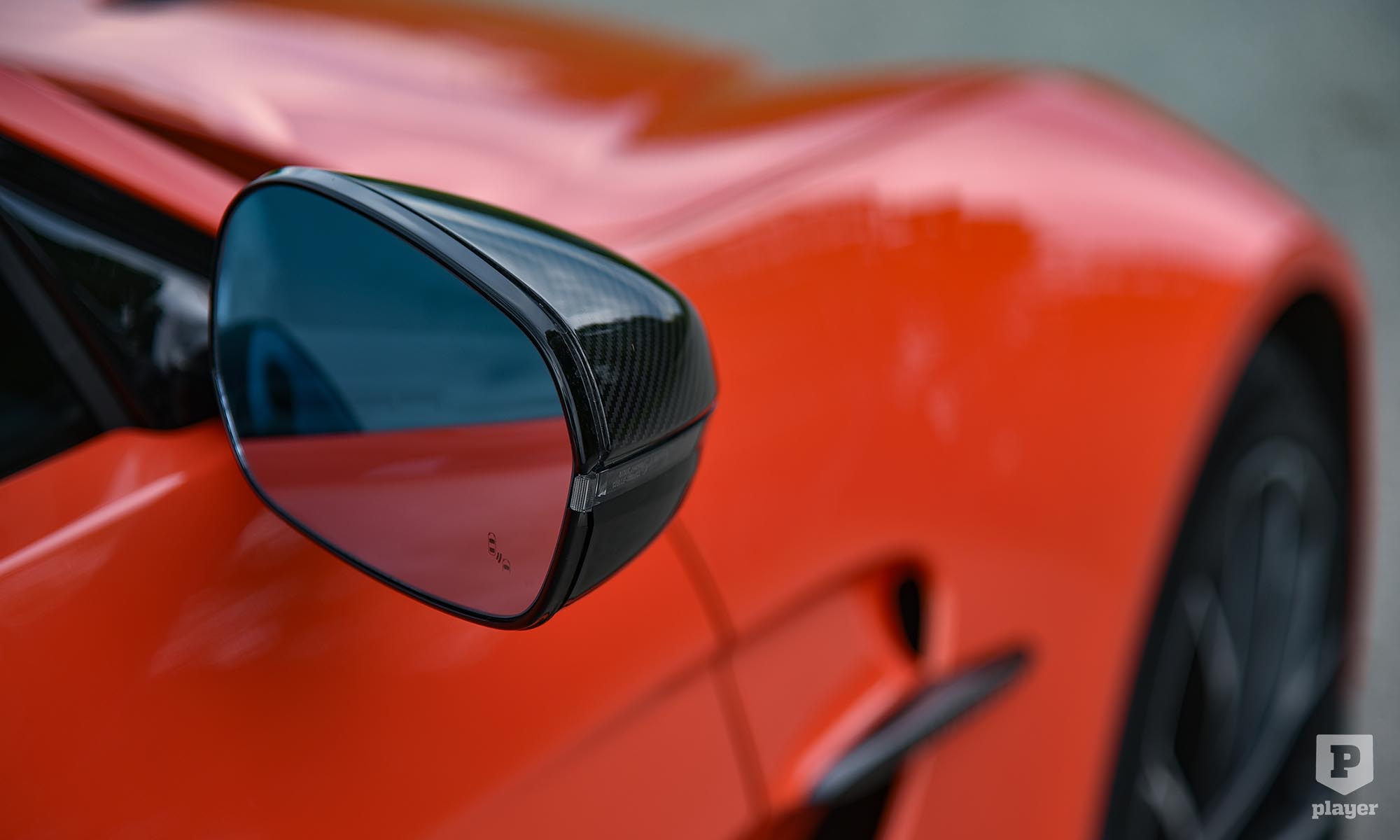 profilból nézve mintha csak egy ugrásra kész sprintfutó volna. A karosszériába simított kilincsek még áramvonalasabbnak mutatják, de a hosszú motorházfedelére vágott légkilépők és a lökhárító két szélén lévő légbeömlők is az aerodinamikát szolgálják, míg a szénszálas splitter feladata az első kerekekre jutó leszorítóerő növelése.