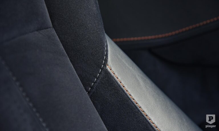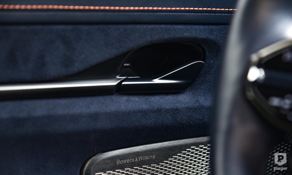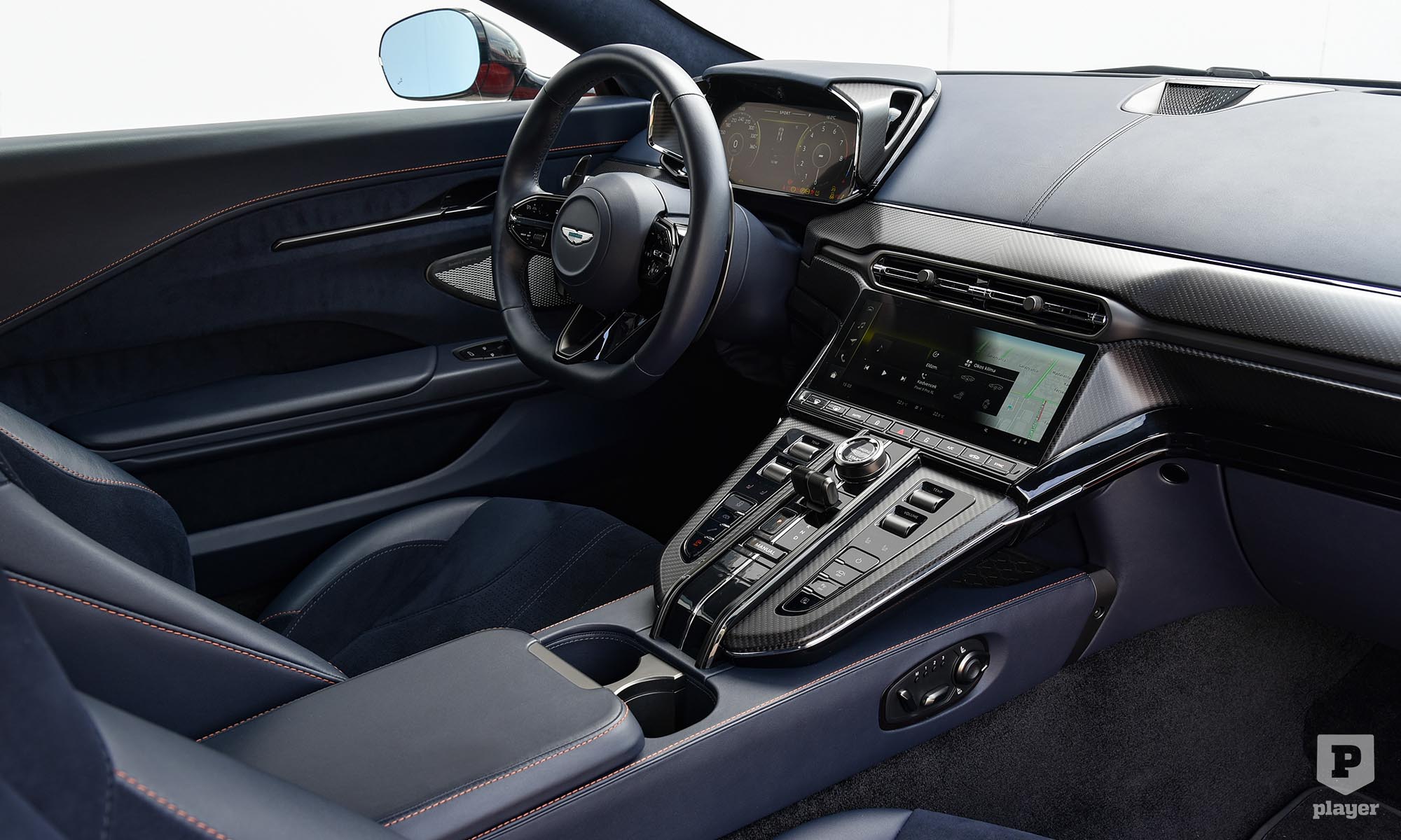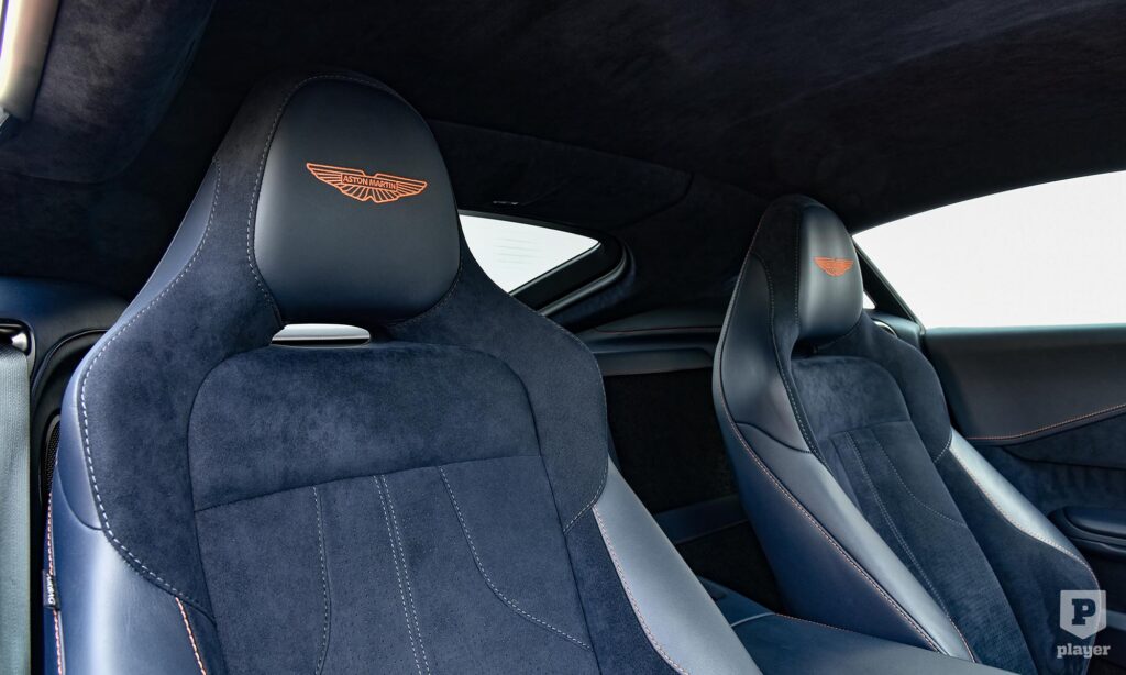 Szoftverek helyett a valódi dolgoktól igazán különleges az Aston Martin sportautója, például az utastérben amerre csak nézünk, a legigényesebb anyagok vesznek körbe. Jó illatú, finom tapintású bőrrel és alcantarával vonták be a kabint, és bár a Cosmic Orange fényezéshez meglepőnek tűnhet a sötétkék bőr, a narancs cérnával varrva mégis működik. Mindez csak azt igazolja, hogy az Aston Martin egyedi igényeket valóra váltó Q részlegénél nagyon értik a stílust.