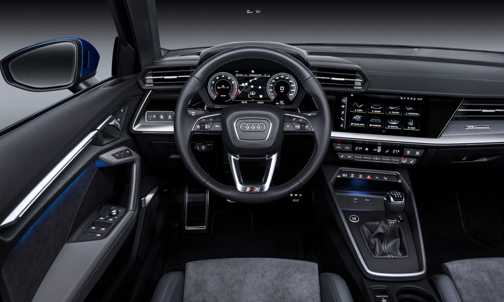 az infotainment karcsú képernyőjét a műszerfalba lehetett süllyeszteni, az újdonságban azonban előtérbe kerültek a kijelzők. Széria a kormánykerék mögötti 10,25 colos display, a középen lévő érintőképernyő alapból 10,1 colos, de akár 12,3 colos is lehet. A kompakt testvérmodellek közül egyedül az Audi maradt meg a hagyományos klímaszabályzónál.