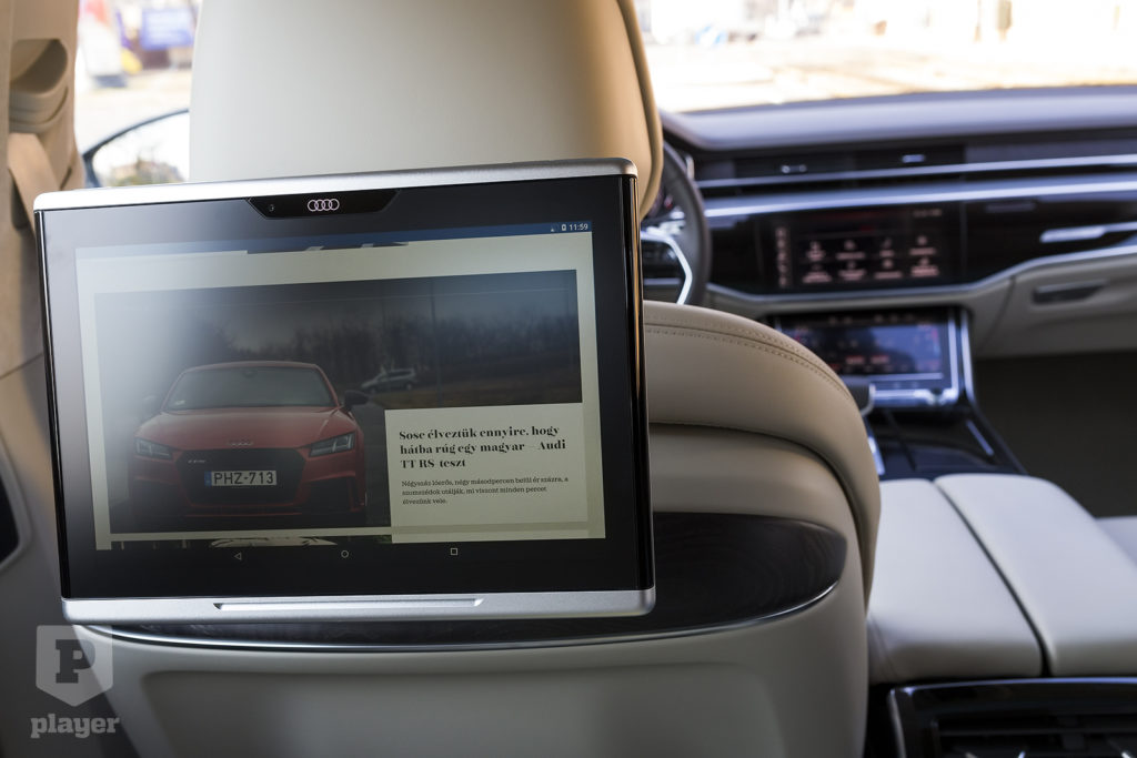 A nyomkodás élménye a hátsó utasoknak is járhat, akik a kartámaszból kiemelhető tablettel állíthatnak mindent, netezhetnek, megnézhetik a kocsi adatait, vagy mondjuk egy filmet addig, amíg a sofőr dolgozik. Már amennyire munka vezetni egy A8-ast.