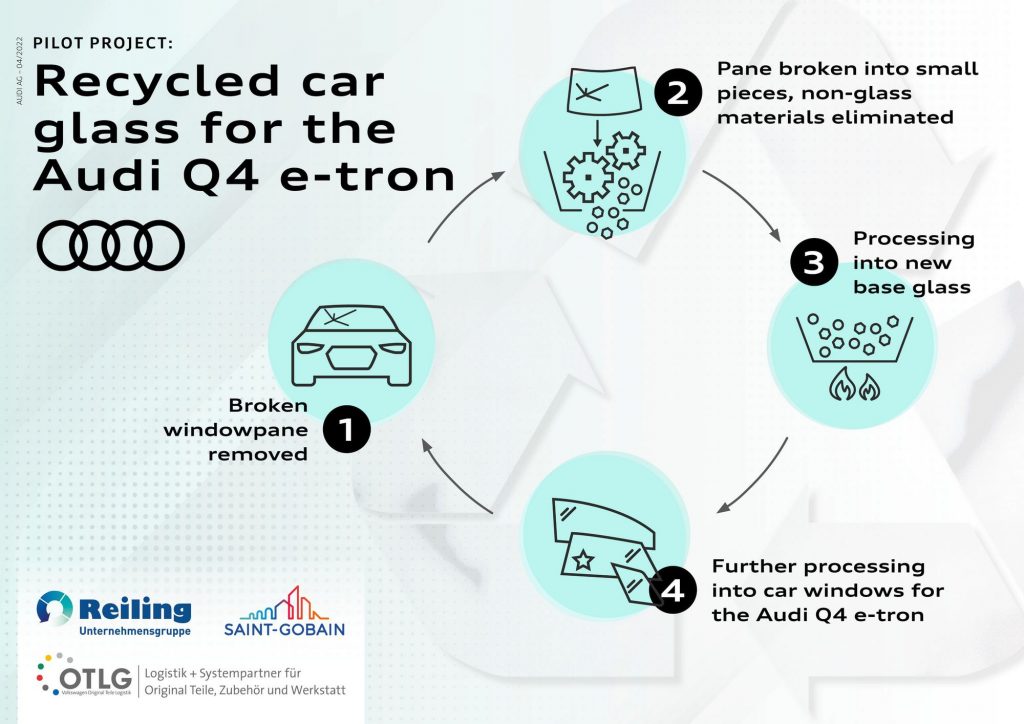 A körkörös gazdálkodás alapelve szerint kezelt üveg a második ilyen eljárással reciklált anyag az Audinál; a cégnél a karosszériaüzemek alumíniumhulladékaiból már 2017 óta lesz egy menetben újra alapanyag. Az autóüvegek visszaforgatása mintegy 30%-os CO2-kibocsátás-csökkentést eredményez ahhoz képest, mintha mindig új üveg kellene az új autóüvegekhez.