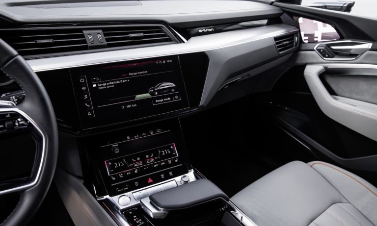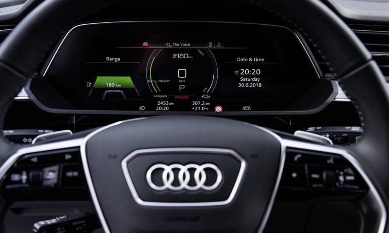 Belül egyébként a legújabb nagy Audik hangulatát hozza az e-tron, ugyanolyan színes képernyős műszeregységgel és dupla érintőképernyős középkonzollal, mint amilyennel az A6-ban, A7-ben és A8-ban találkoztunk, és amilyen a Q8-ba is ilyen kerül. Mivel elektromos autóról van szó, ahol nem zavar a motor zaja, és nagy szerep jut a hifinek, ezért a 16 hangszórós, 705 wattos Bang & Olufsen hifi hangzását külön kiemelték a gyáriak.