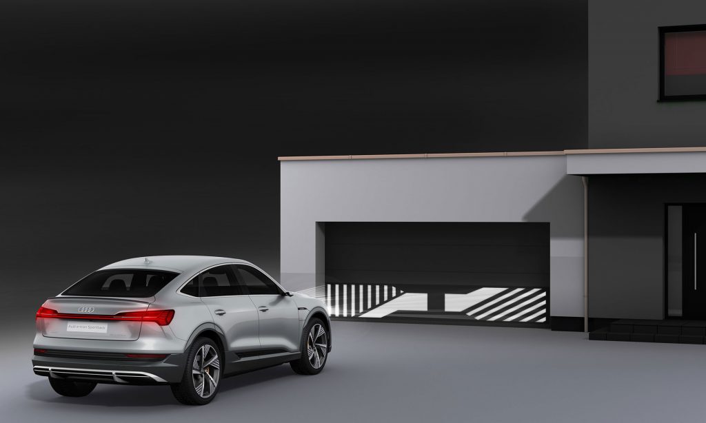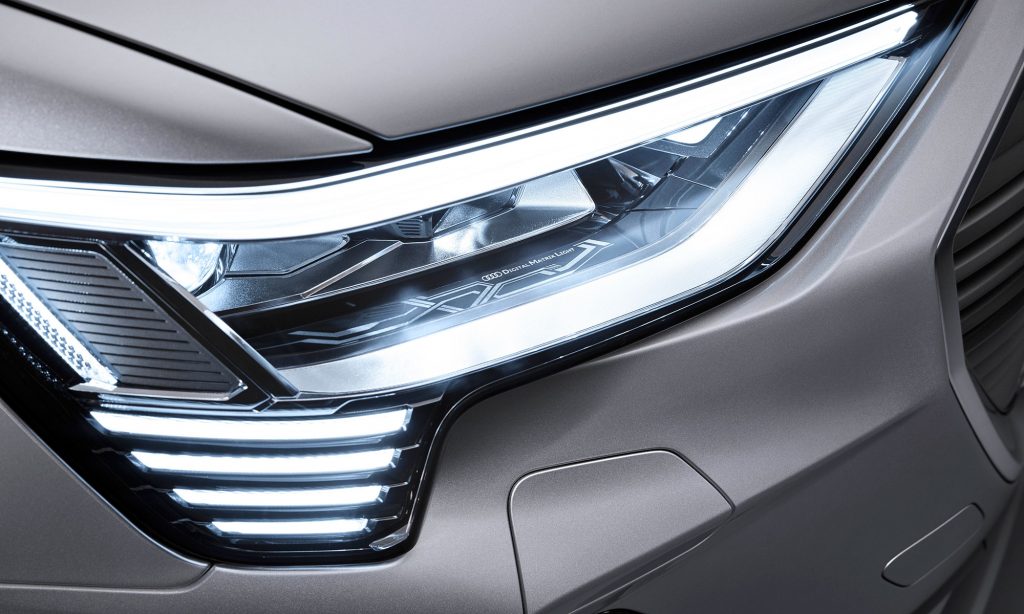 Még egy újdonságot kapott az e-tron Sportback, a digitális mátrixfényszórót, amiben milliónyi egyenként mozgatható tükör van, ezzel pedig nemcsak a fénykévét állítja, de üzeneteket is vetíthet az útra.