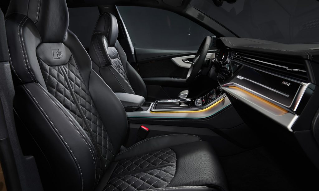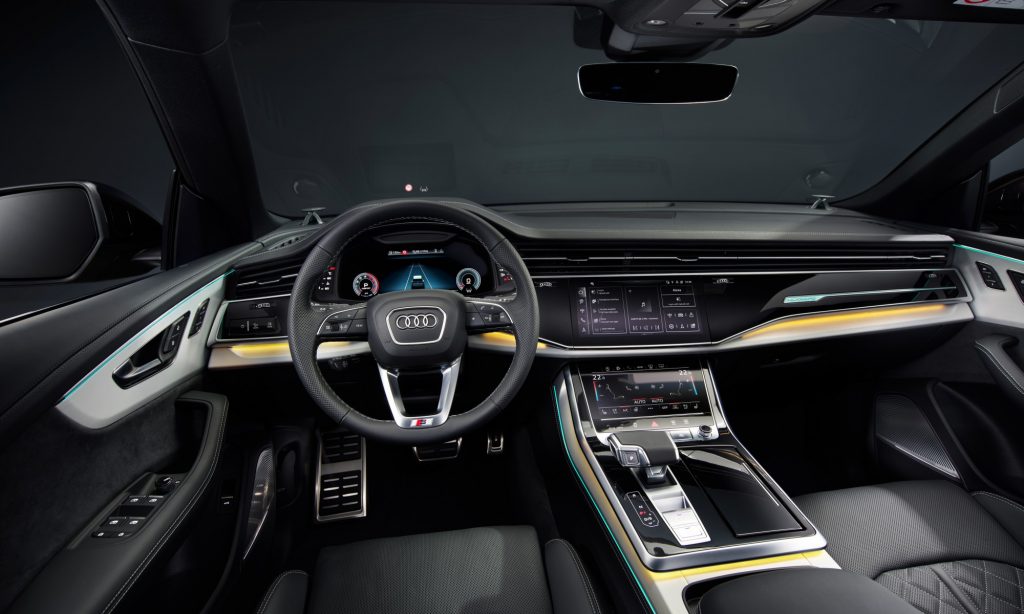 Visszavettek a díszítőelemekből a dizájnerek a frissített Audi Q8-asnál, de a meglévő részletek sokkal kidolgozottabbak. Ott van az autó egyik fő eleme, a hűtőmaszk, melynek a korábbival ellentétben már fűzött mintázata van és a kerete egészen a fényszórók közepéig nyúlik be. Három új fényezési opció jelent meg az autón, a képeken látható Sakhir Gold, továbbá az Ascari Blue és a Chili Red. Teljes szélességben világító OLED hátsó lámpái vannak, elöl pedig lézeres LED mátrix fényszórók, ezeknek a nappali menetfénye állítható rajzolatú.