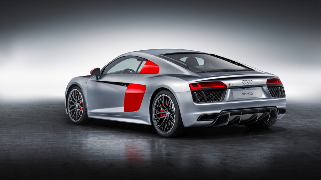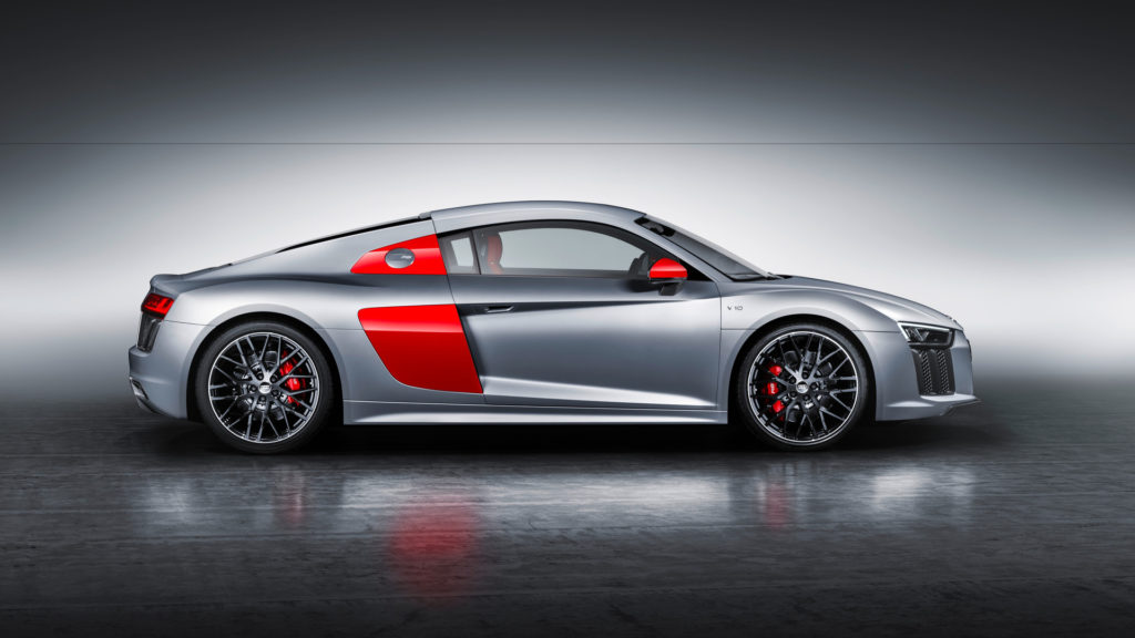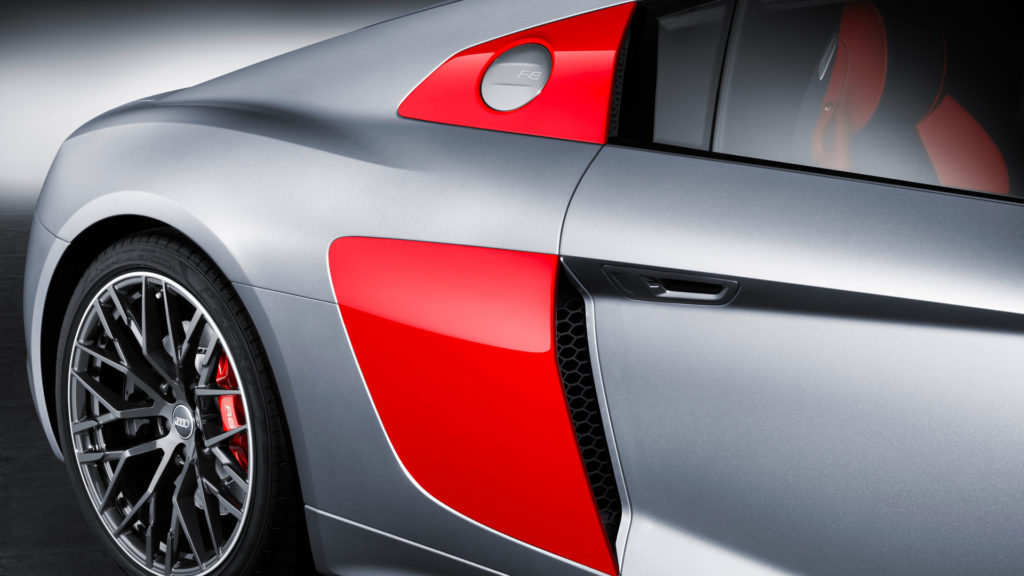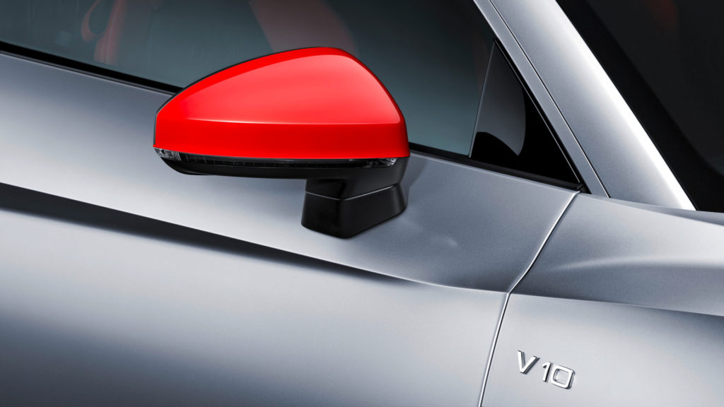 A vevő háromféle szín, fehér, fekete és ezüst közül választhat, az utóbbi pedig lehet a hagyományos metál, vagy a képeken látható izgalmas matt árnyalat is. Az oldalsó burkolatok és a visszapillantó tükrök minden színnél vörösek, így lesz igazán versenyautós az R8 Audi Sport Edition megjelenése.
