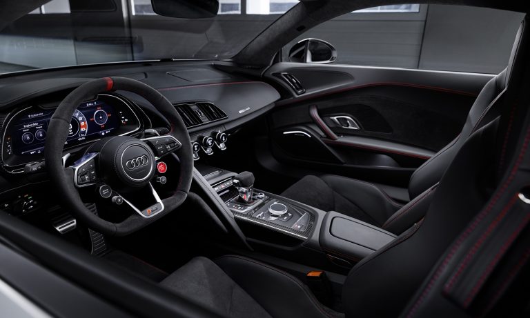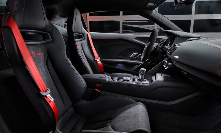 Utastere sportautóhoz illően fekete kárpittal burkolt, a sötétségből pedig piros varrások és színben passzoló biztonsági öv tűnik ki. A műszeregység az R8-ból ismert digitális, melyen a navigáció képe is megjeleníthető, hogy biztosan célba érjen a hétvégi pályanapig.
