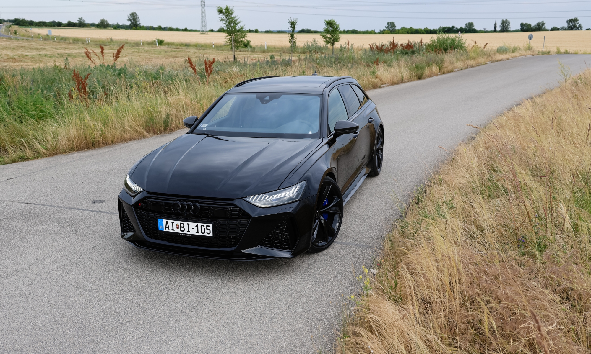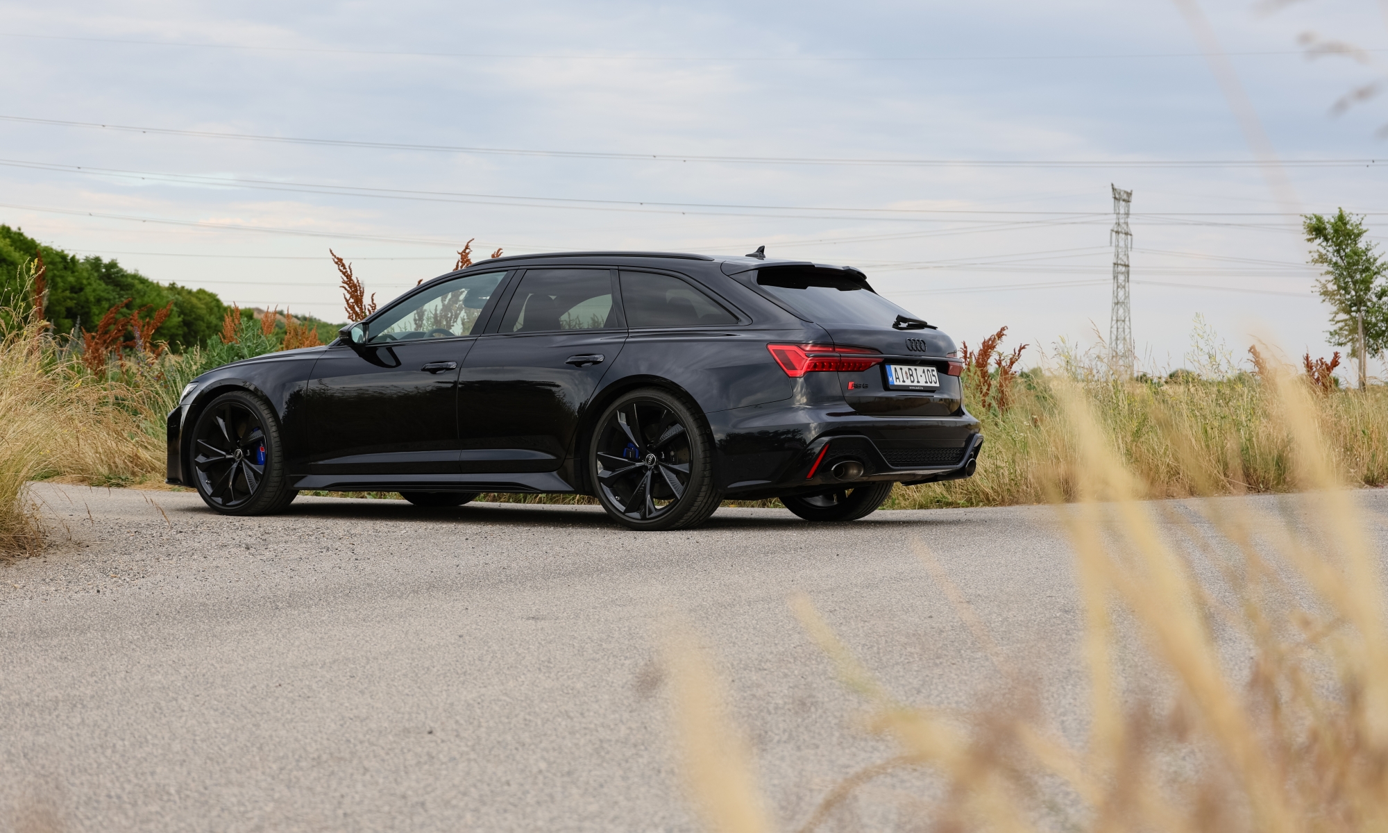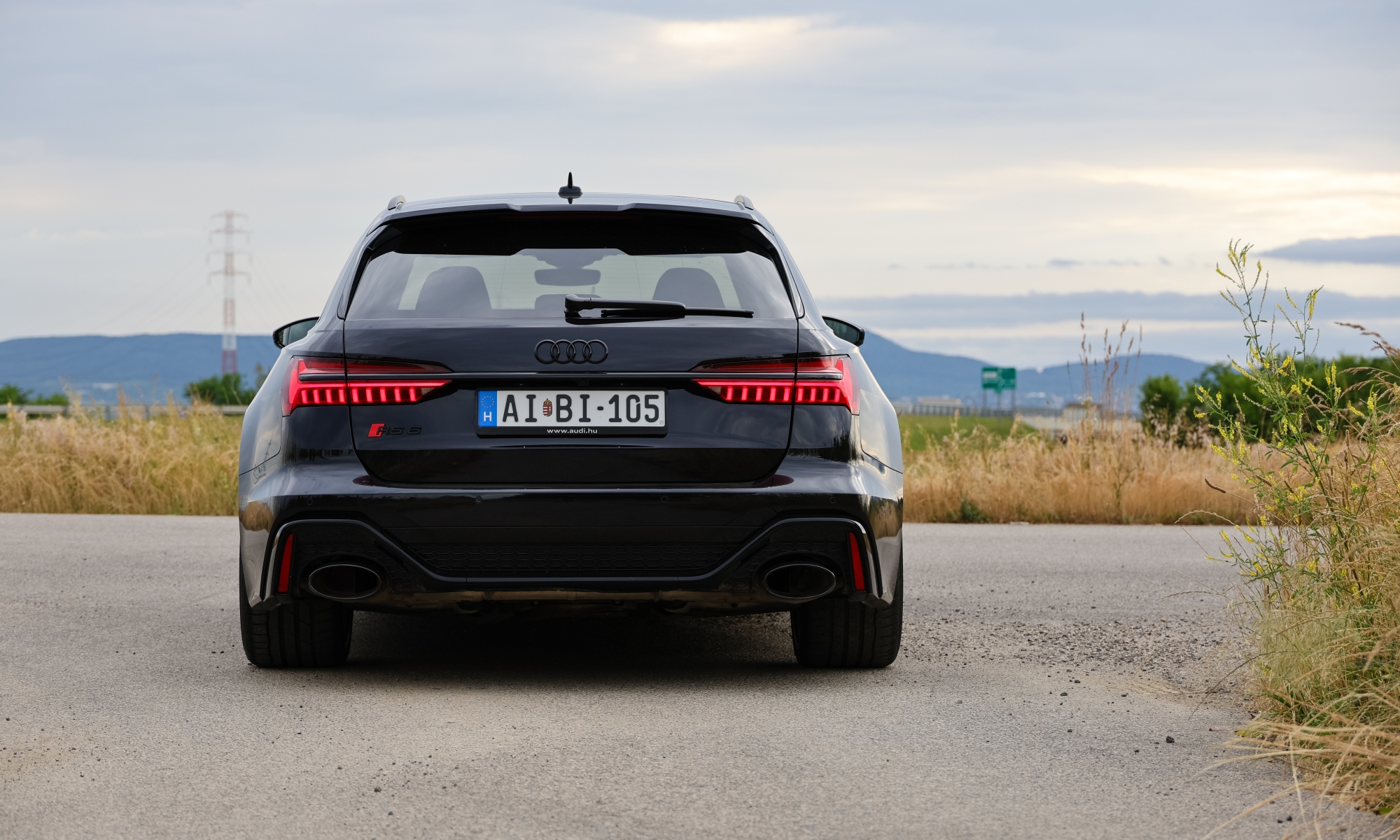 Baljósabb kiállása van, mint Darth Vadernek bármikor a Star Wars történetében, az Audi RS 6 Avant Performance ebben a napsütésben kéklő Sebring feketében maga a tömény technokrata kegyetlenség. Sokat elmond az RS 6 Avantról, hogy a kombi A6-tal csak néhány karosszériaelemen osztozik, a nagyobbat terpesztő nyomtáv miatt az RS 7 Sportback arcát viseli és a tükörben jó ránézni, hogy oldalanként 40 milliméterrel szélesebb. Élesre vasalt lemezein a párhuzamosok még a végtelenben sem találkoznak, a versenyautók stílusában kigyúrt sárvédő szélesítések pedig úgy feszülnek rá az ötküllős felnikre, mint Gymshark Onyx a masszív izmokra.