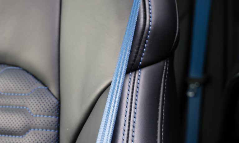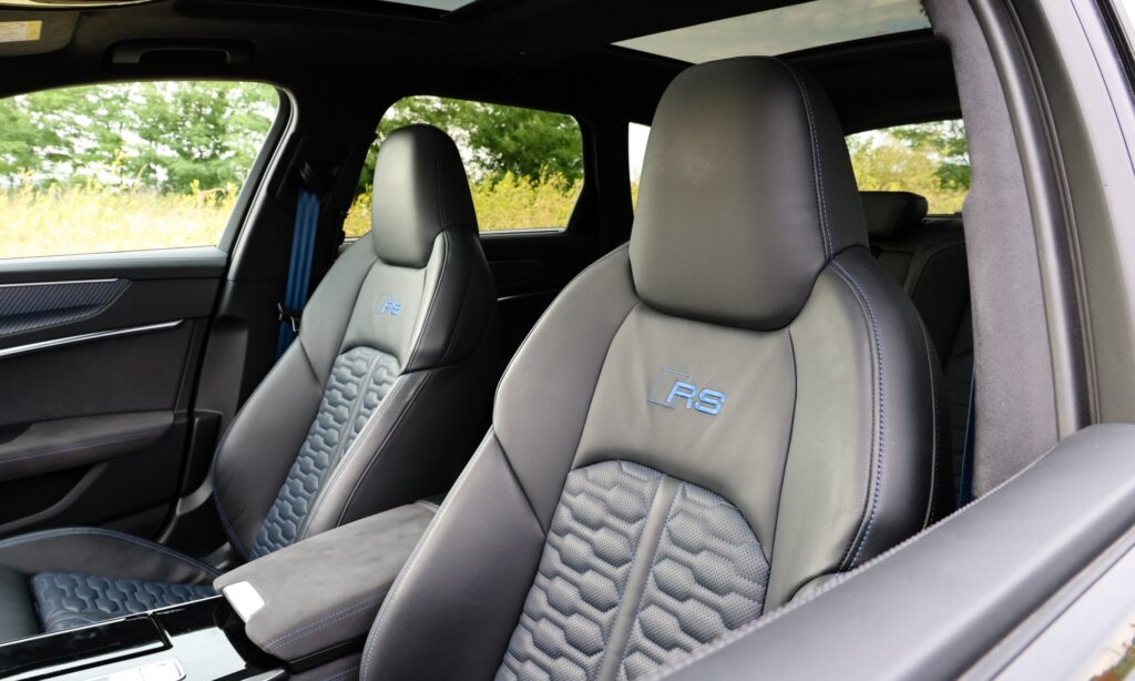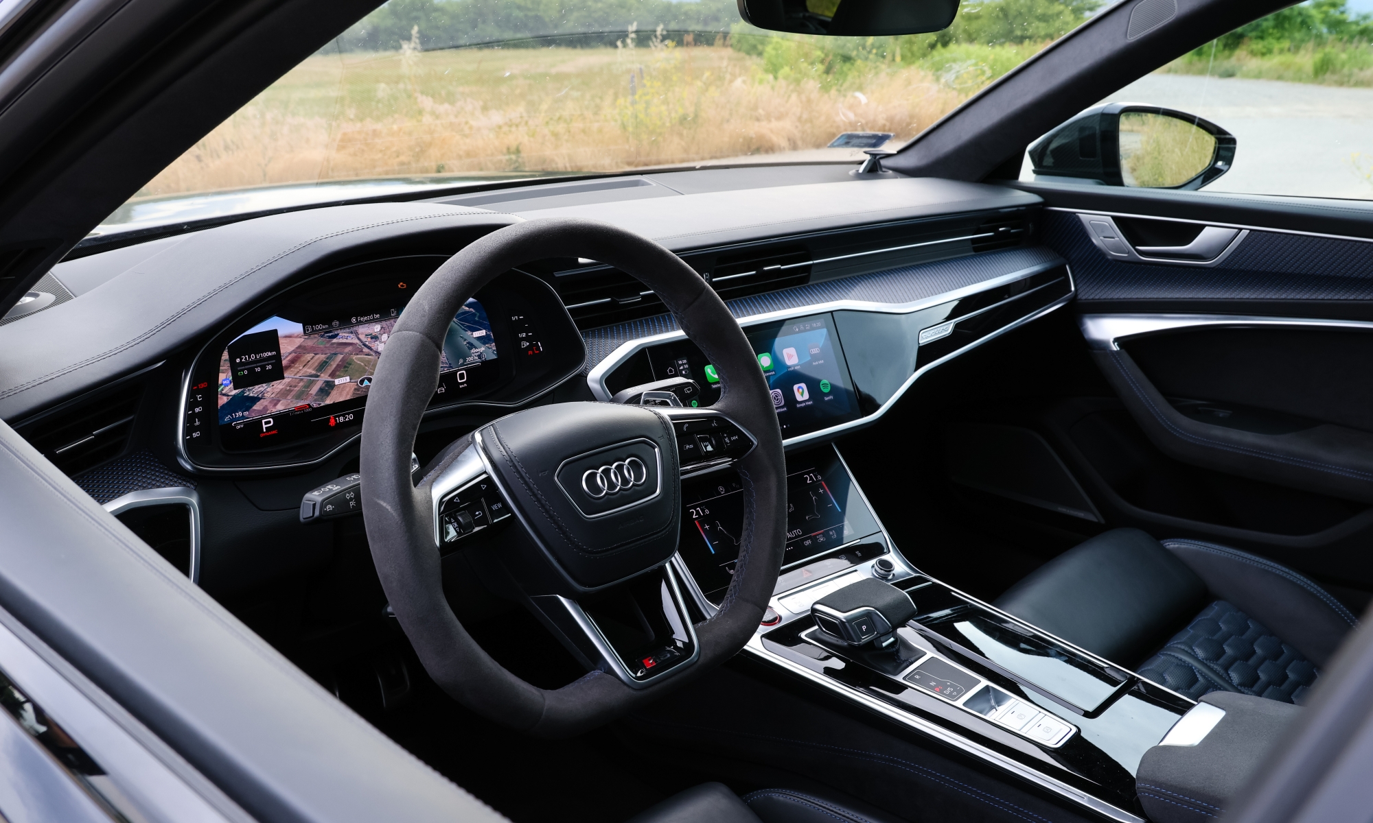 Határozottan tart az RS 6 Avant Performance kék cérnával varrott sportülése, a kezeim között alcantarába varrt sportkormány van, mely sokkal inkább versenyautót és kesztyűs kezeket kíván, de ebben a sportkombiban van annyi tűzerő, hogy viselni tudja. Az üléseken és a műszerfalon finom tapintású fekete bőrkárpit van, a karbon dekorbetétekben a cérnára rímelő kék szálak futnak. Halk kattanással húzza be a szervomotor az ajtót, becsatolom a kék biztonsági övet, aztán megnyomom a piros karimás indítógombot, a tűzfal mögött pedig azonnal dübörögni kezd az RS 6 Avant Performance biturbó V8-asa. Rezgései átjárják az egész karosszériát, kis gázra rendesen meglöki az autót, mintha lazán megütne egy bokszzsákot az edzés elején.