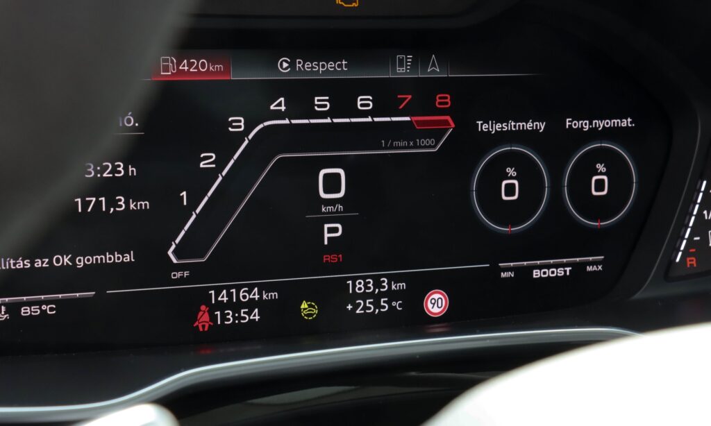 Éles kontrasztban áll egymással a digitális kijelzők gyönyörű, tűéles képe, és a pusztító rövidítésekkel, nyakatekert fordításokkal magyarra eszkábált menü. Ha az MMI érintőképernyőjén szeretnék valamit beállítani, akkor rendre egekbe szökött vérnyomással káromkodok, hogy ezen a színvonalon szól a vezetőhöz. Ugyanakkor a rendszer gördülékenyen működik, gyorsan lehet leásni a menü mélyére hangulatvilágítást állítani vagy telefont csatlakoztatni, aztán ott az Apple CarPlay. Virtuális műszeregysége a kormányról két gombbal állítható, így a klasszikus elrendezés helyére pillanatok alatt a navigáció utasításai kerülhetnek vagy központi helyre a fordulatszámmérő. Angolra állítva jobb a digitális élmény.