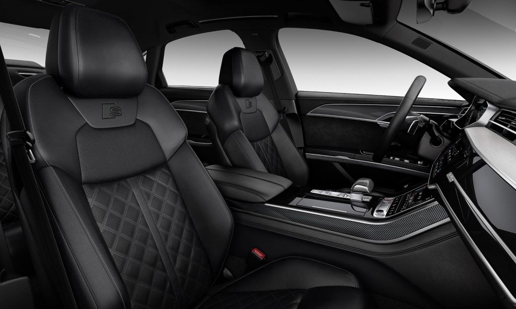 Az S8 ezzel az Audi-limuzinok csúcsát képviseli, amit a külseje is érzékeltet, egyedi hűtőmaszk és nagy légbeömlős lökhárító jár hozzá, a lézeres fényszóró és OLED hátsó lámpa is széria, akárcsak a sportosított ülések steppelt varrással.