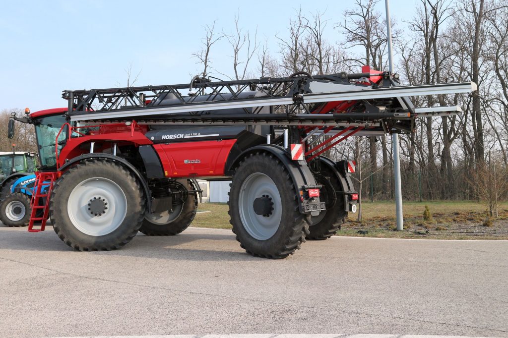 Az önjáró permetező közúton akár 50 km/h-val is közlekedhet. Ez méretei miatt ijesztően hangzik ugyan, de fentről cseppet sem tűnik veszélyesnek, már csak azért sem, mert a magasból mindent belátni, mindenre bőven van idő felkészülni. És igen, ha nagyon muszáj lenne, beférnék alá a kocsival, még egy 1,95 méter magas Transporterrel is, mert a gép minimálisan 1,6 méteres hasmagassága két méterre is megemelhető. Sőt: akár nem csak oldalról, hanem elölről vagy hátulról is be lehetne futni a Horsch alá egy autóval, mert a nyomtáv is állítható, 2,25 és 3 méter között. (Sőt: opciósan 3,00–4,00 méteres nyomtávval is kérhető a gép.)