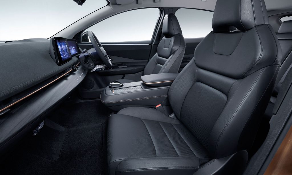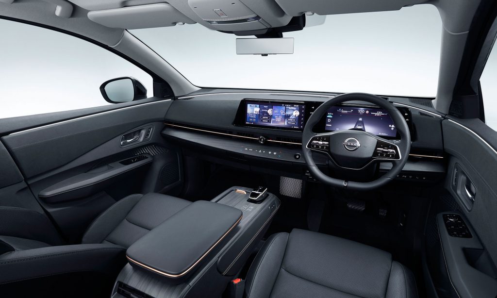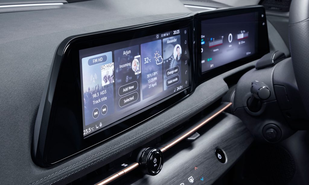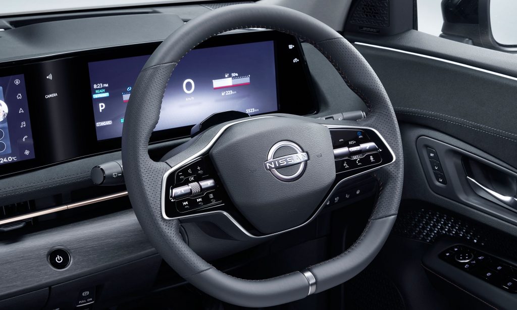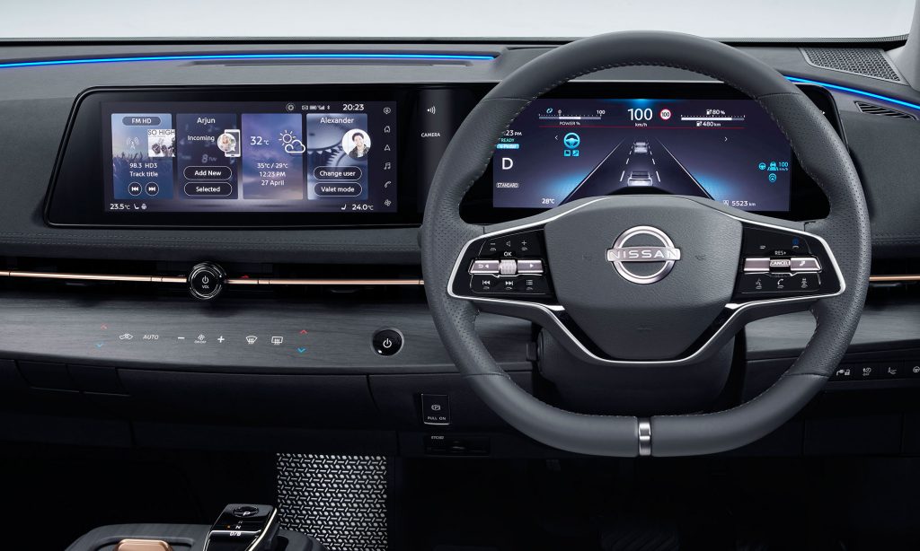 Az Ariya berendezése futurisztikusan letisztult, a kétküllős kormánykerék mögé két darab 12,3 colos színes képernyő került,