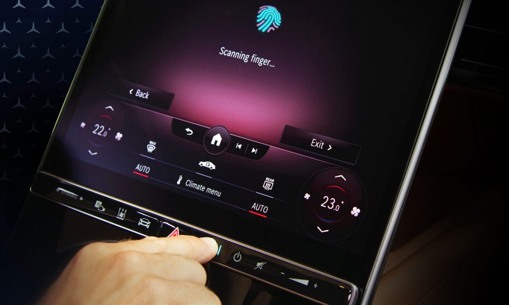 A képernyő alsó élére ujjlenyomatolvasó került, de hang- és arcfelismerés is működik, amivel biztonságosan azonosítja a vezetőjét az S-osztály.