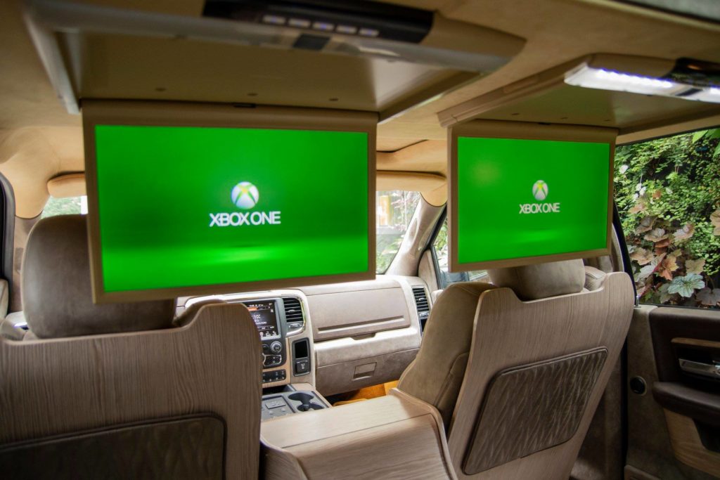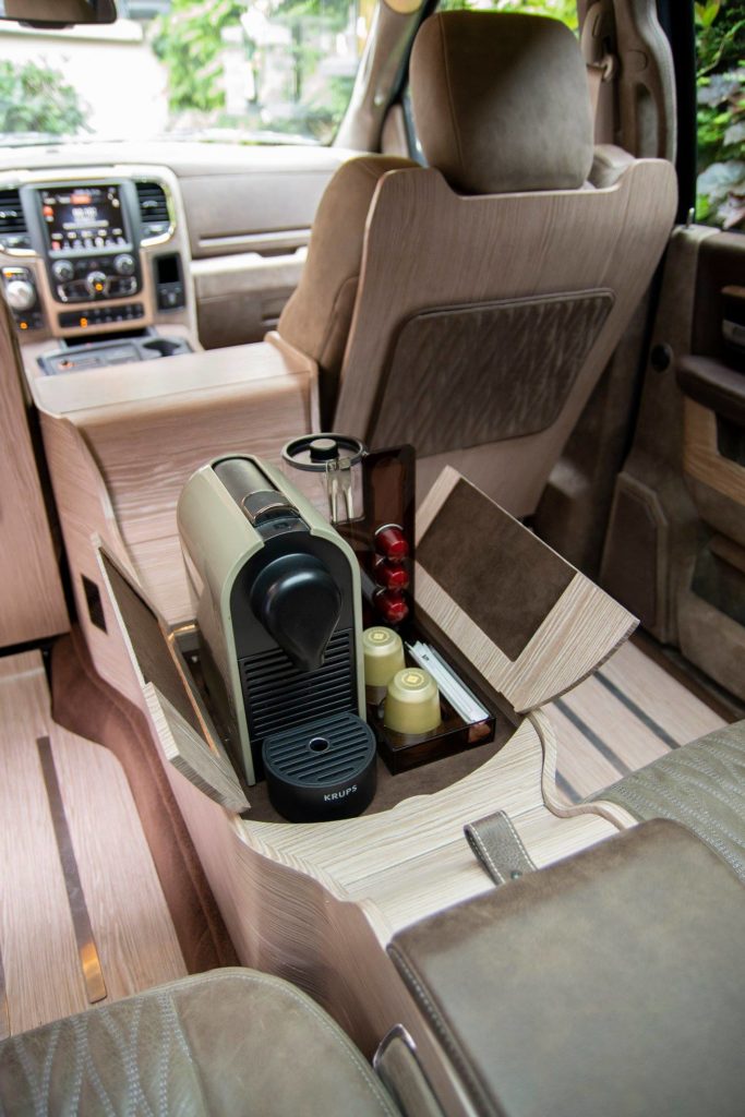A tetőből például két 17 colos monitor hajtható le, amelyen Xboxozni lehet, és hogy ne panaszkodj az ellátásra, a középső konzolban hűtőgép és bárszekrény is található. A leglátványosabb azonban alighanem az, amikor gombnyomásra előbújik a Nespresso kávégép, hiszen végtére olaszok építették az autót.