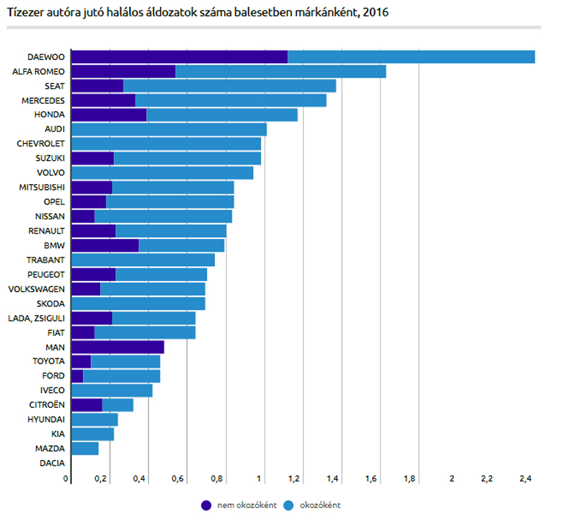 A 2016-os adatokat vizsgálták, akkor 301-en haltak meg autóban ülve. A pontosabb összehasonlítás érdekében nem az abszolút számot nézték, hanem azt, hogy adott márka tízezer darabjára hány halálos baleset jut (azokat a márkákat kihagyták, amelyekből nem fut tízezer darab az utakon, mert a ritkaságoknál torz eredmény született volna). Fontos tudni, hogy az adatokból nem lehetett kiszűrni a haszonjárműveket, tehát amelyik márka kínál furgont vagy akár kamiont, az is benne lehet a számokban.