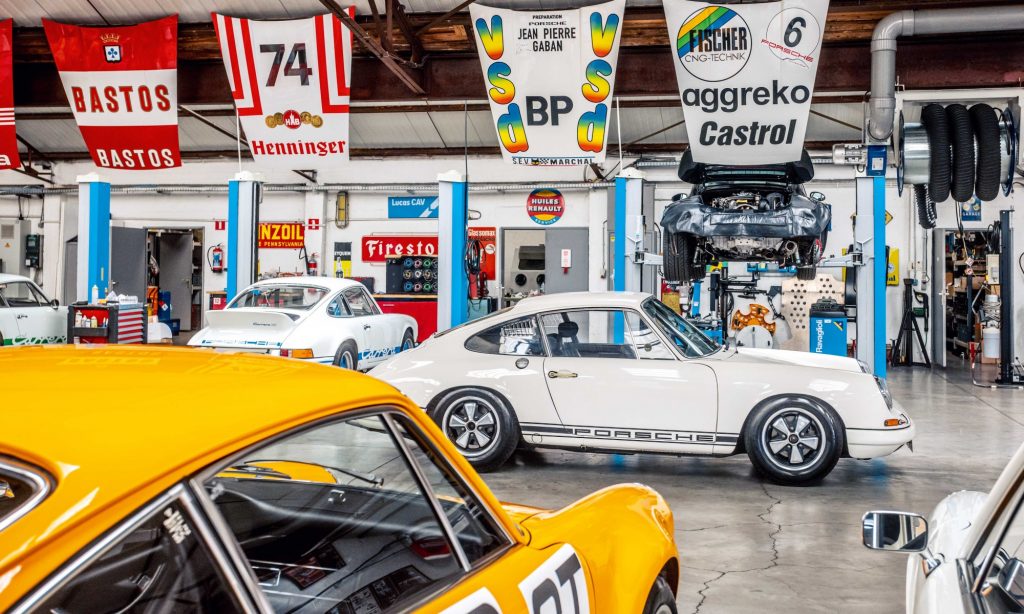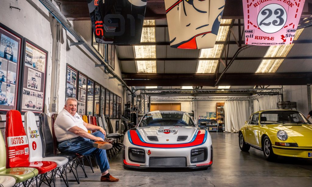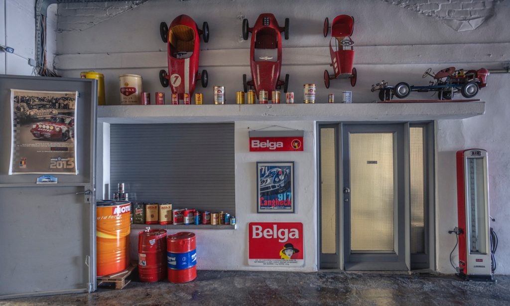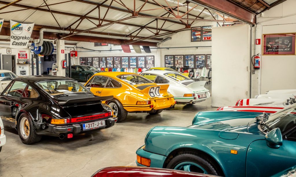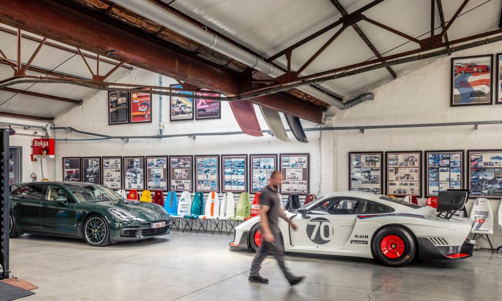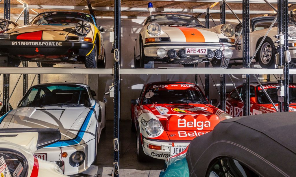 Tágas térben, lámpákkal és a tetőablakokon át beáradó fénnyel megvilágított garázsban nagyjából 50 darab Porsche áll a belgiumi Antwerpenben. Az egyik falnál székek sorakoznak, mindnek egyedi mintázata van, melyek Porsche versenyautókat idéznek. Temérdek apróság fedezhető fel körbe a garázsban az autózáshoz kapcsolódó régi erekélytől a plafonról lógó színes csomagtérfedelekig.