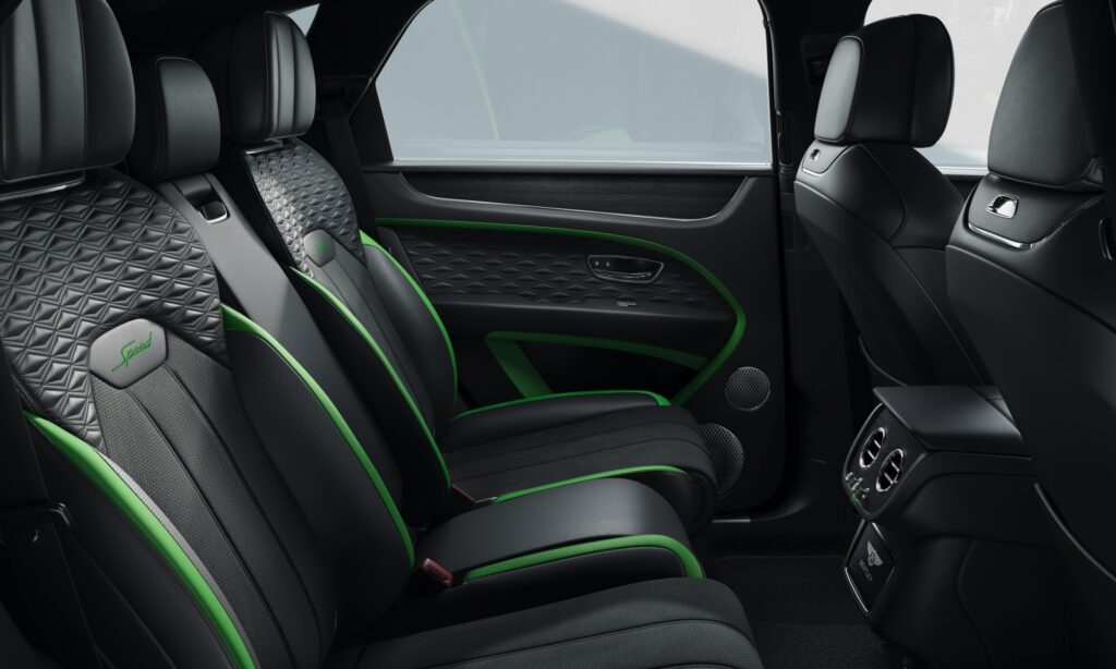 Utasterében mindenhol felbukkan a Speed verzió logója, melyet minden ülés háttámlájába hímeztek, valamint a nagy műgonddal készített dekorbetétekben is megjelenik. A Bentayga Speed digitális műszeregységének egyedi grafikája van és a karosszériához hasonlóan króm helyett magasfényű feketék a gombok és szellőzőnyílások. Természetesen a Bentley Bentayga Speedhez is bármilyen színű belső elérhető, amennyiben a vevő nem sajnálja rá a pénzt, de a sötét árnyalatok állnak igazán jól ennek az autónak.