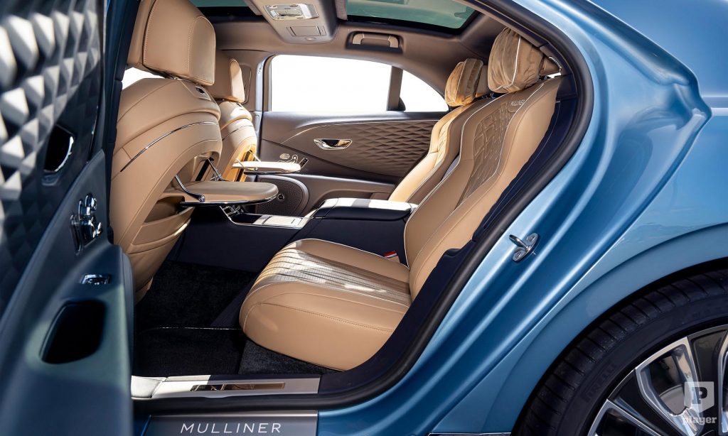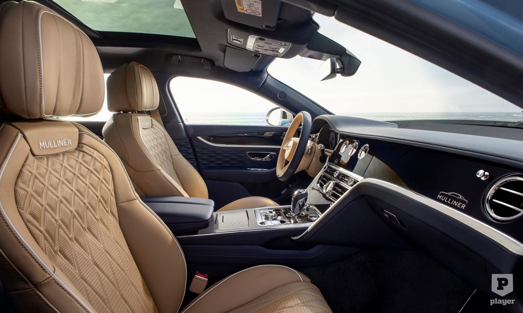 Az utastérben is egyértelmű, hogy a Mulliner változatról van szó, hiszen ezt a nevet olvashatjuk a megvilágított küszöbökön és az ülésekre hímezve is.
