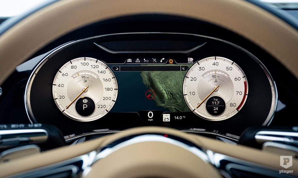 a minta minden egyes gyémántja 712 öltést tartalmaz. A belső felszereltség része a forgatható kijelző, a fűthető kormánykerék és a panorámatető mellett a műszerfal ékszereként a Mulliner időmérő óra.