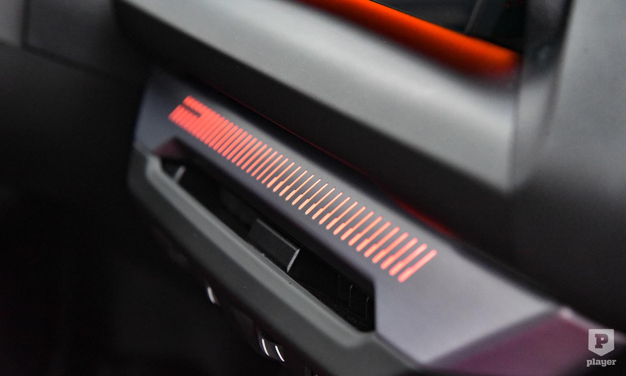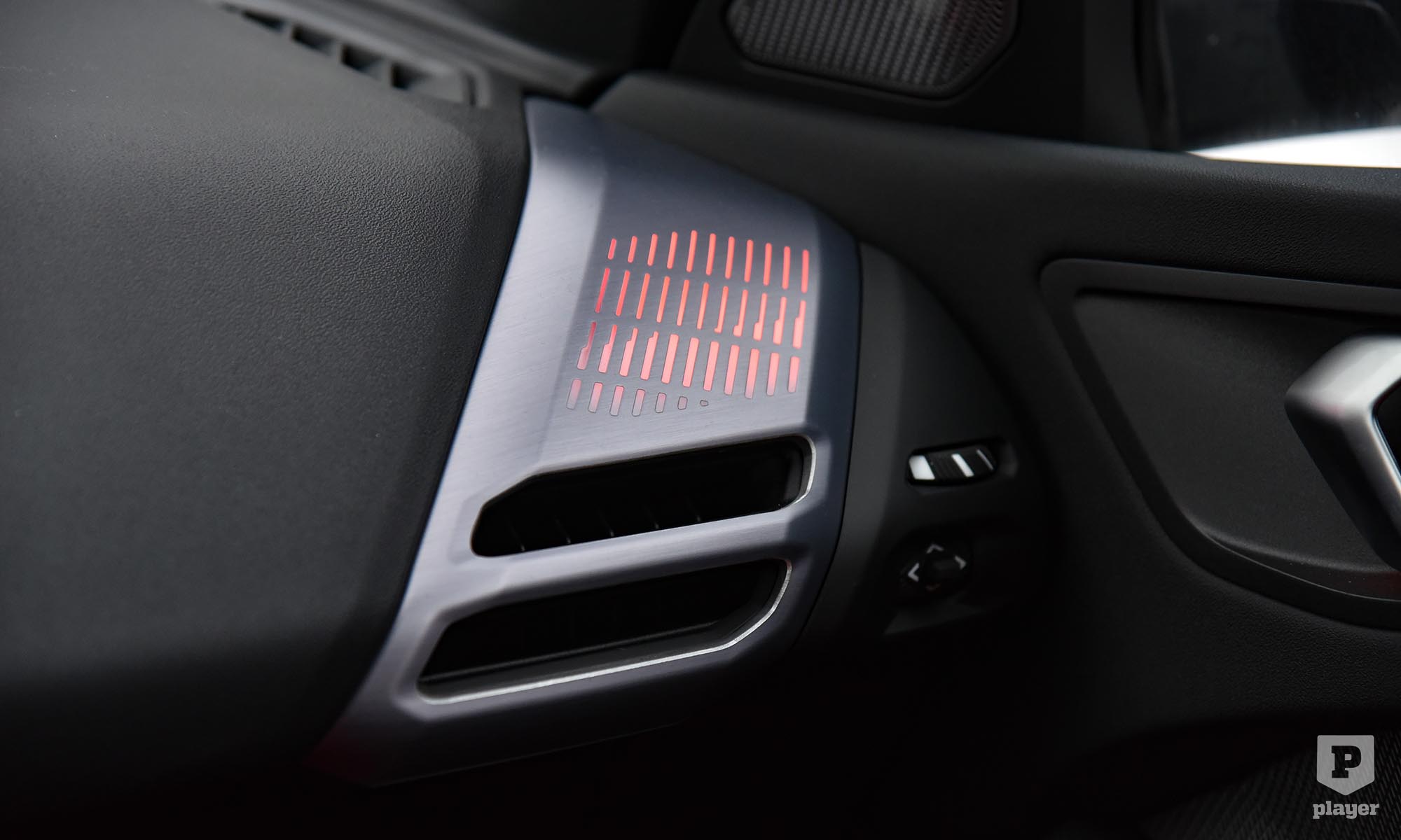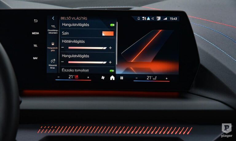 Egyszerűsödött a műszerfal. Egy Teslához viszonyítva persze még így is egy gombrengeteg, de nincs már önálló hifi- és klímapanel, összeért a két monitor, pöcök lett a váltókar. Megújultak a szellőzőnyílások és a belső fények, mindkettőt az aluborításban találjuk, előbbit kis joystickkel, utóbbit a menüből állíthatjuk, akár M-es kék-piros színátmenetesre is. Így néz ki nappal: