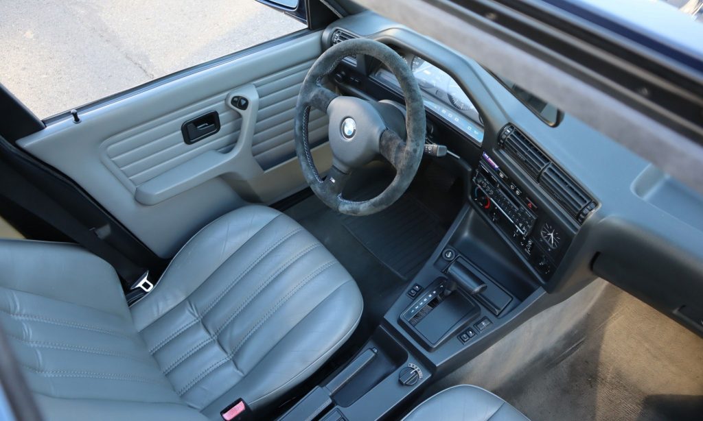 Ezt az autót 1991-ben, tehát az E30-as utolsó évében vették át Németországban és az egészen biztos, hogy nem spóroltak rajta egy fillért sem. A sötétkék metál fényezés, a világosszürke bőrkárpitos beltér és a négyfokozatú automata váltó, valamint a klíma és a sportkormány mind sok pénzért mért opciós tételek. Az autó felújításakor a alcantarába húzták a kormányt és a tetőkárpitot.
