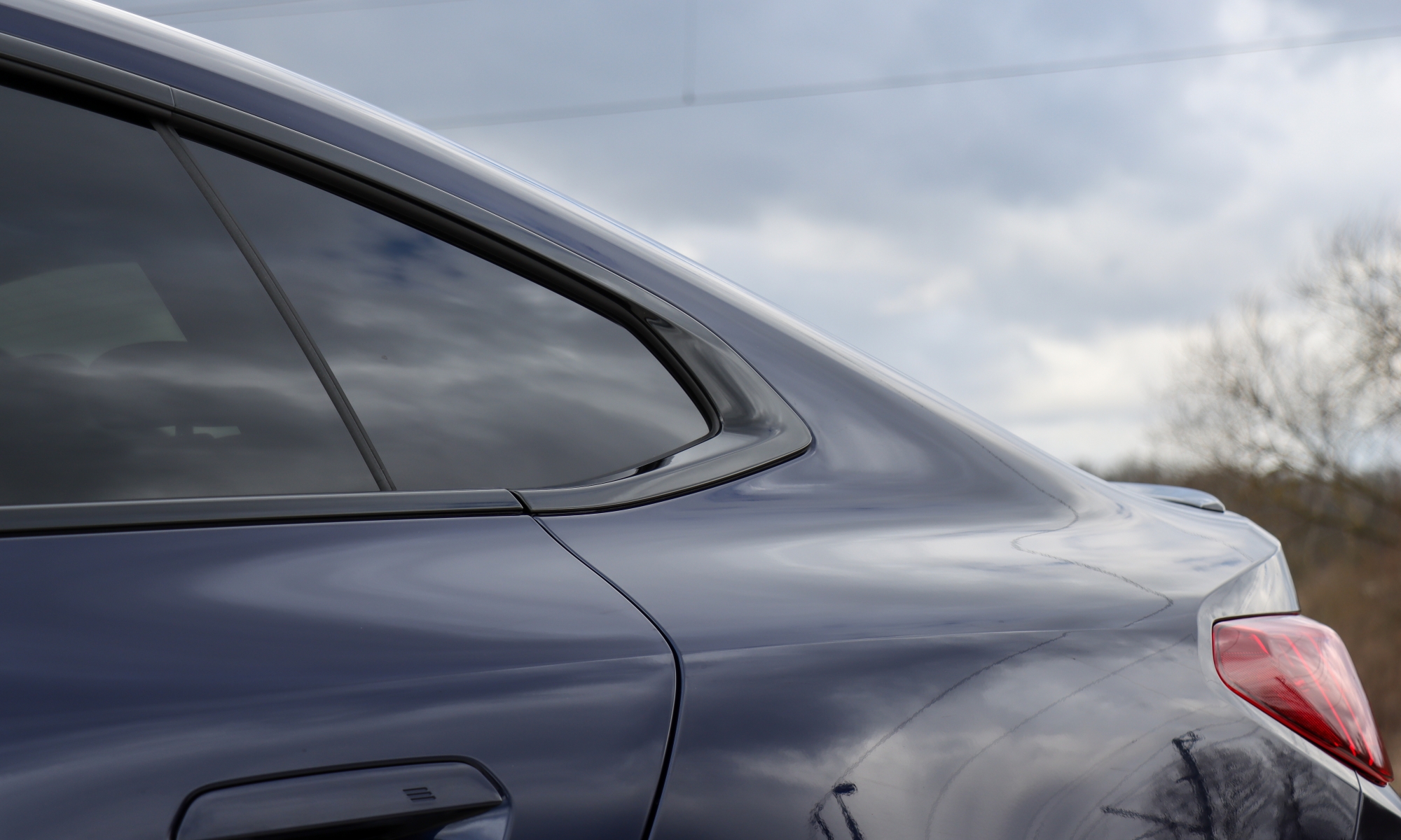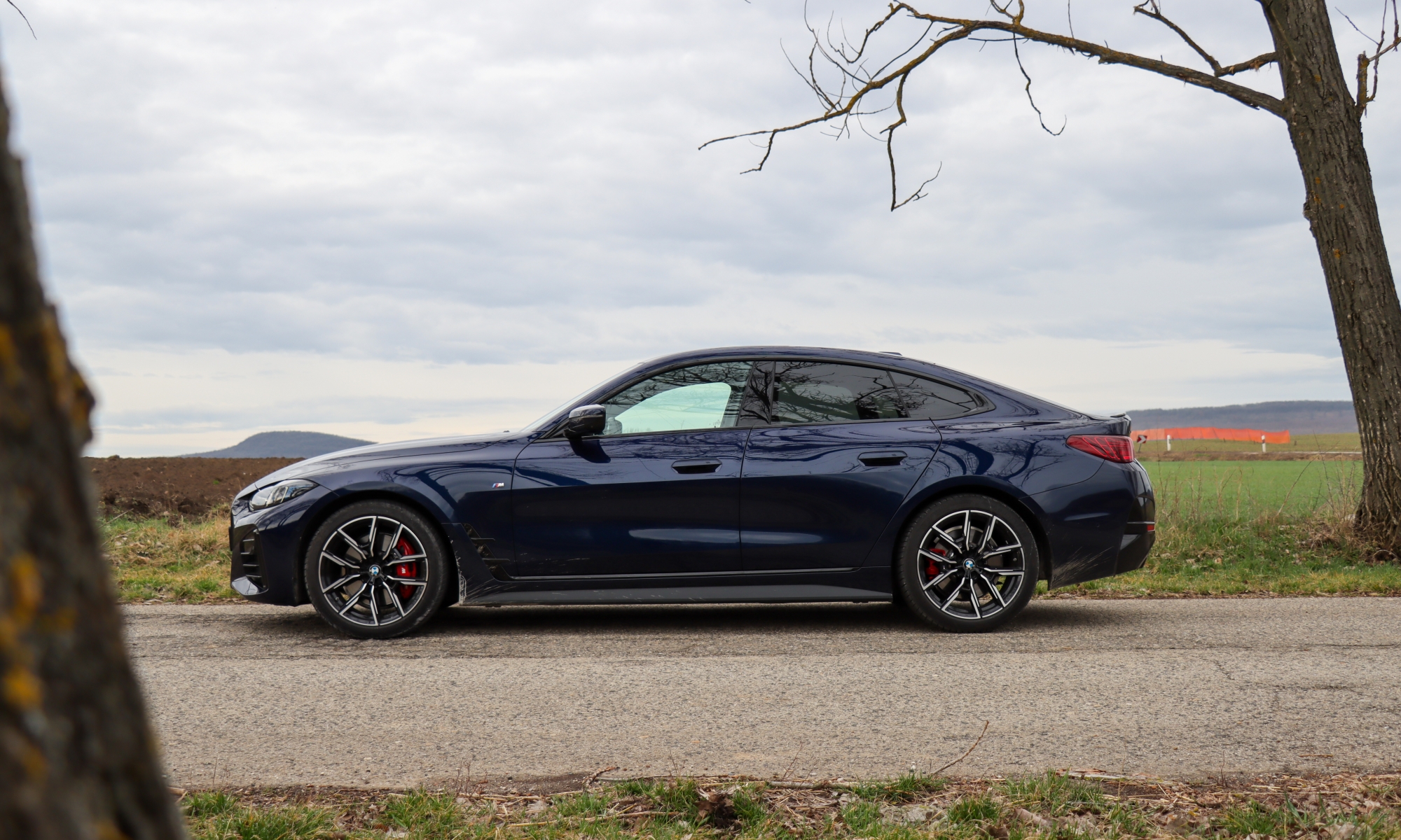 Hullámzó vonalak olvadnak a hosszan domborodó gépháztetőbe, mintha nyugvó víztükör volna, a tetőív pedig lágyan folyik bele a 4-es Gran Coupé rövidke farába, melyen apró szárny tereli az autón átsuhanó légáramot. Mélykék fényezése szépen megmutatja a sárvédők domborításait és az ajtókon áthúzó éleket. Őrzik a kupés tradíciót a keret nélküli ablakok, a kilincsei meg az ajtólapokba simulnak, mint utoljára az E39-es 5-ösön, mely nem mellesleg csak néhány milliméterrel kisebb, mint most ez a G26-os kódú 4-es.